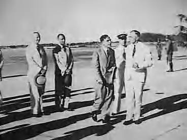 De nieuwe gouverneur P. Kasteel (donker pak) arriveert op Curaçao. Hij wordt ontvangen door dr. C.