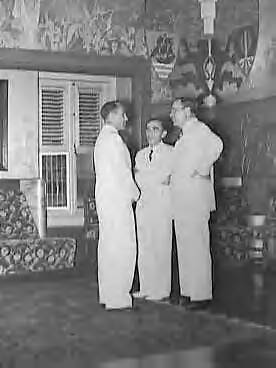Serie bezoek van minister H.J. van Mook aan Curaçao. Receptie in het Gouvernementshuis met gouverneur P.A. Kasteel. Met onbekende