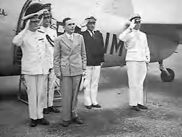 Bezoek van de minister van Marine, J. Th. Furstner (links), aan Curacao. Tijdens het spelen van het volkslied. Naast Furstner (in burger) gouverneur P.A. Kasteel