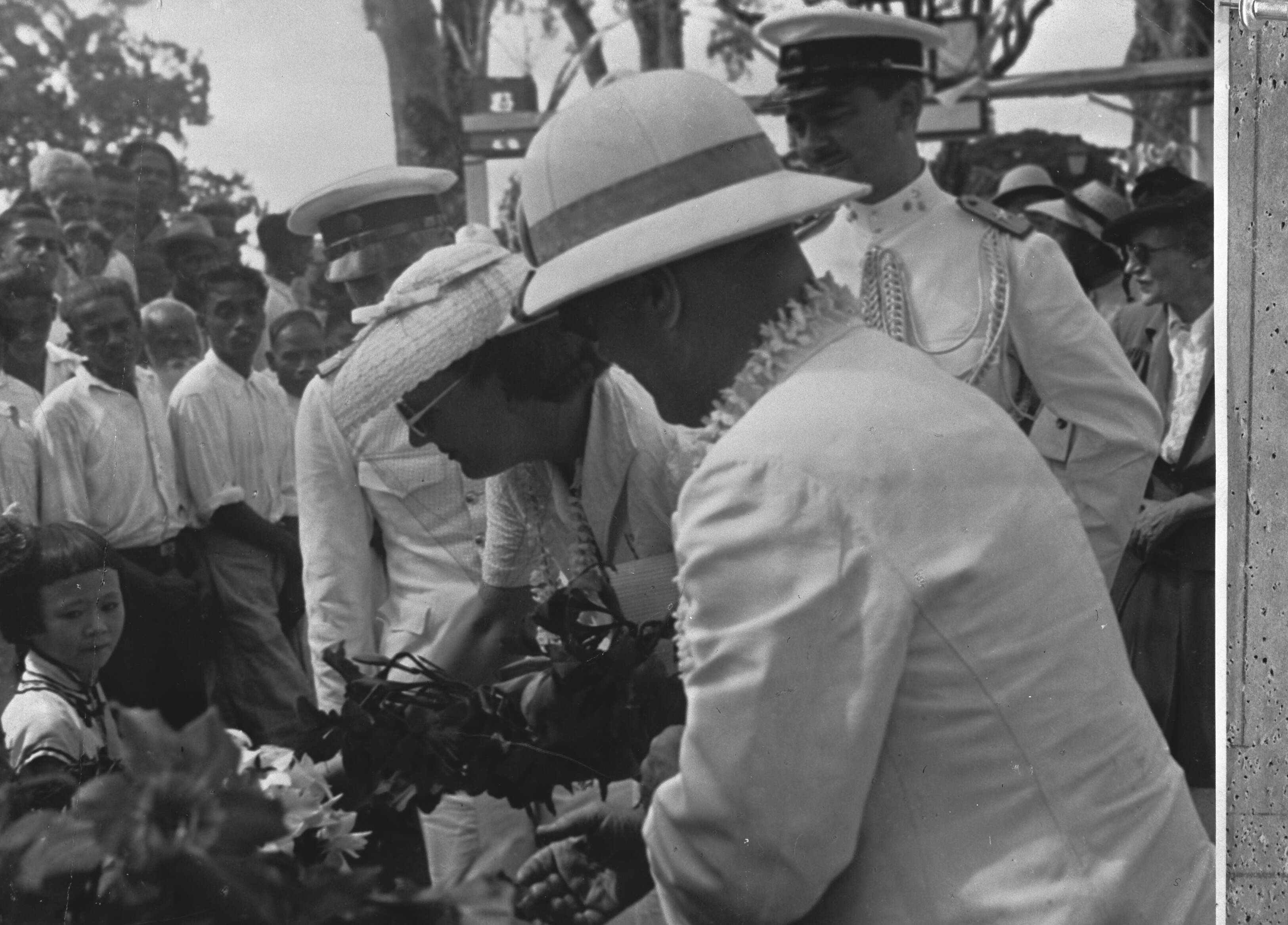 Bezoek van prinses Juliana aan Suriname (1943). De prinses ontvangt bloemen uit handen van een Chinees meisje.