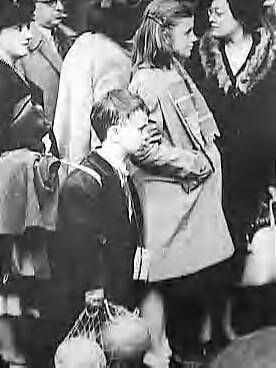 Nederlandse vluchtelingen in Londen. Een kleine vluchteling, met zware bepakking en twee voetballen in een netje in een rij bij London Station