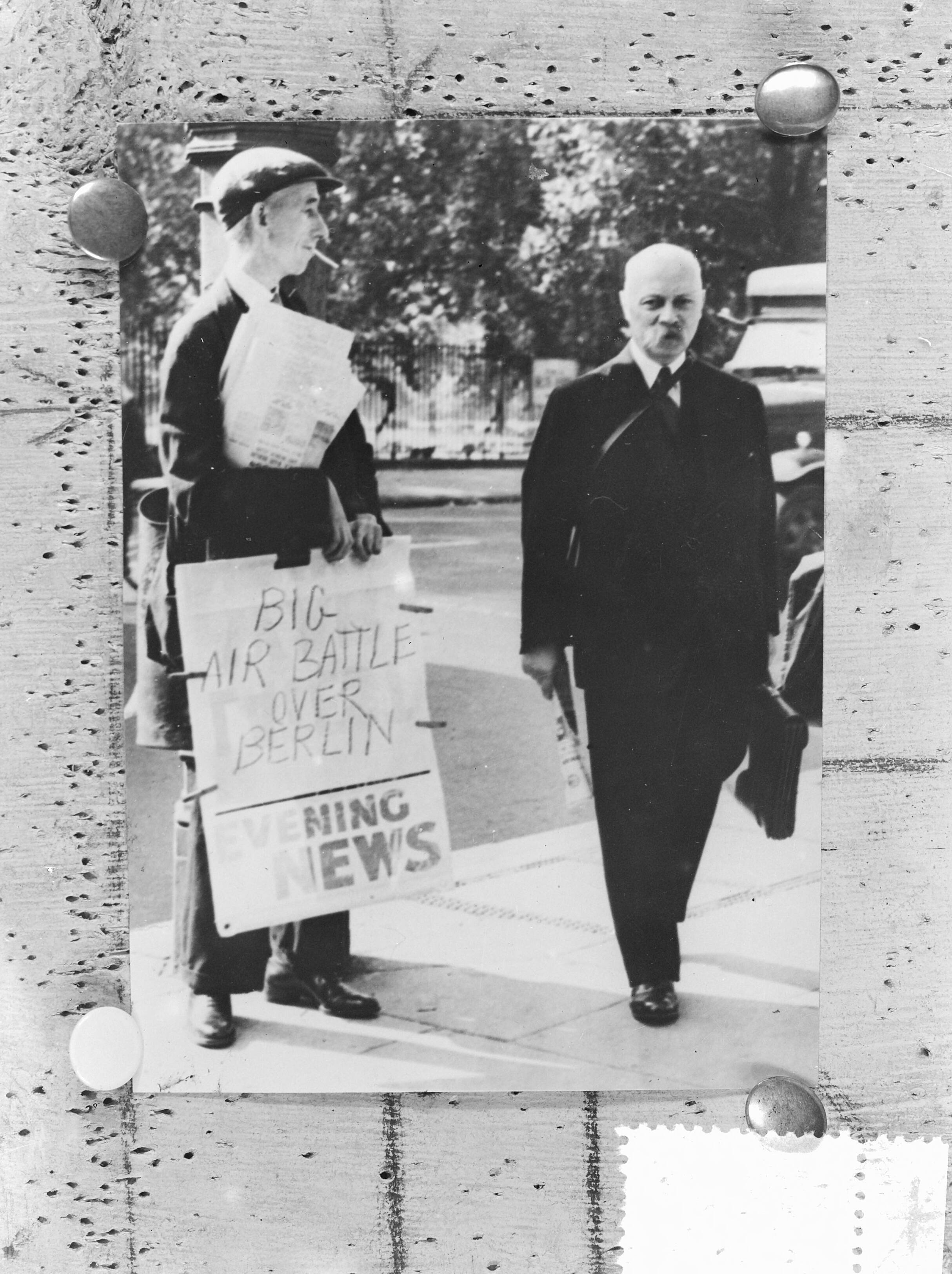 Minister-president Gerbrandy passeert een krantenverkoper op Piccadilly Square te Londen