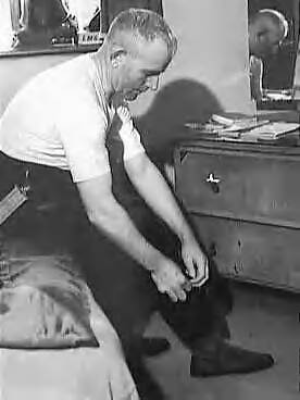 Serie Koninklijke Marechaussee in Engeland. Marechaussee Kitz, die verblijft in het Pastoria Hotel, St. Martin Street, Londen, kleedt zich aan