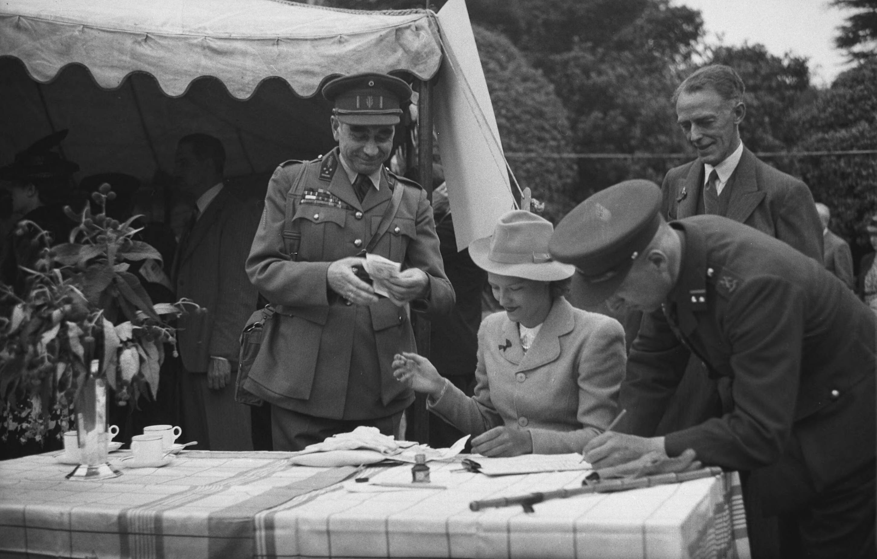 Ter gelegenheid van de verjaardag van prins Bernhard werd er een tuinfeest gehouden in de tuin van een Engels herenhuis voor de de leden van de Nederlandse kolonie in Londen ter ondersteuning van het Prins Bernhard fonds - Het Nederlandse "Spitfire" fonds voor alle Nederlanders waar ook ter wereld. Een telegram werd gestuurd naar de prins die in Canada verblijft bij vrouw en kinderen. De welbekende Nederlandse zwemkampioene Willy den Ouden ontvangt een bankbiljet van 1 pond van een Belgische generaal (links) en een Nederlandse kolonel (rechts) die het telegram zullen tekenen