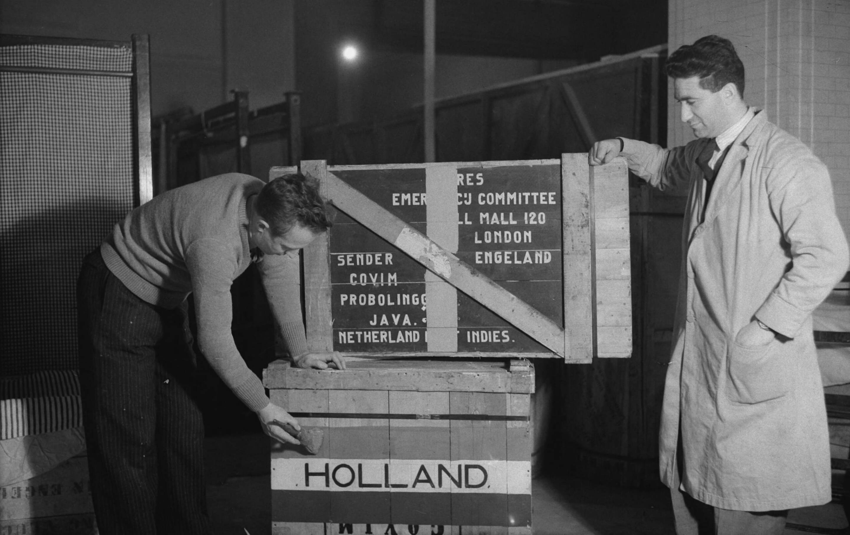 Nederlanders van over de hele wereld verzamelen geschenken voor het Nederlands volk in bezet gebied. Kisten worden bewaard in Engeland tot de eerste gelegenheid ze naar Nederland te zenden. Op de afbeelding een kist gezonden uit Probolinggo, een stad in Java, Nederlands-Indië