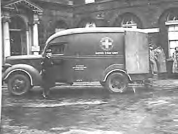 Lord Illife (staand rechts op de achtergrond), overhandigt in Warwickstreet te Londen, in plaats van lord Clarendon, een mobiel röntgenapparaat aan het Nederlandse Rode Kruis