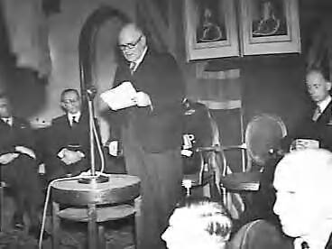 Viering van de ontdekking van Nieuw-Zeeland door Abel Tasman (1642) in the New Zealand Forces Club, Charing Cross Road, Londen W.J. Jordan, Hoge Commissaris van Nieuw-Zeeland, spreekt de aanwezigen toe