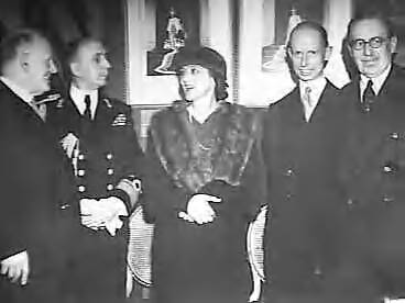 Viering van de ontdekking van Nieuw-Zeeland door Abel Tasman (1642) in the New Zealand Forces Club, Charing Cross Road, Londen. Vlnr. W.J. Jordan, Hoge Commissaris van Nieuw-Zeeland, schout-bij-nacht baron de Vos van Steenwijk, adjudant van koninigin Wilhelmina, prinses Ia, dr. E.N. van Kleffens, E. Michiels van Verduynen