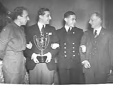 Voetbalwedstrijd tussen een Belgisch en Nederlands team in Londen. Receptie in de Connaught Rooms voor leden van de teams, het erecomité en officiële genodigden. De Cup, die België behield door het behaalde gelijkspel, wordt getoond. Vlnr R. Billiet, de Belgische aanvoerder, de heer Nieuwenhuis, secretaris van de Belgische regering, met de cup, W. v.d. Oever, de Nederlandse aanvoerder en A. Meewis, secretaris van de Belgische Voetbal Bond