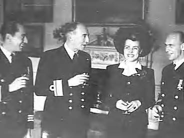 Officieren en manschappen van geallieerde marines gedecoreerd in het Admiralty House. Rear Admiral H.B. Rawlings (2e van links) spreekt met Poolse marine-officieren van de torpedobootjager Soko, en een echtgenote van een van hen, na de plechtigheid.