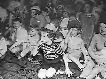 Kerstfeest van de Admiralty voor kinderen van geallieerde marine-officieren. De kleinzoon van de Engelse premier Churchill, Julian Sandys (in gestreept jersey) geniet van de poppenkast. Met hem in de eerste rij zitten Nederlandse kinderen