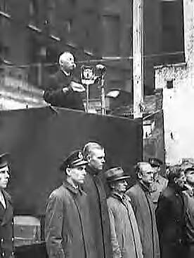 Nederlandse kerkdienst ter herdenking van de Duitse invasie van 1940 op de plek van de gebombardeerde kerk in Austin Friars, Londen. Toespraak van minister-president Gerbrandy