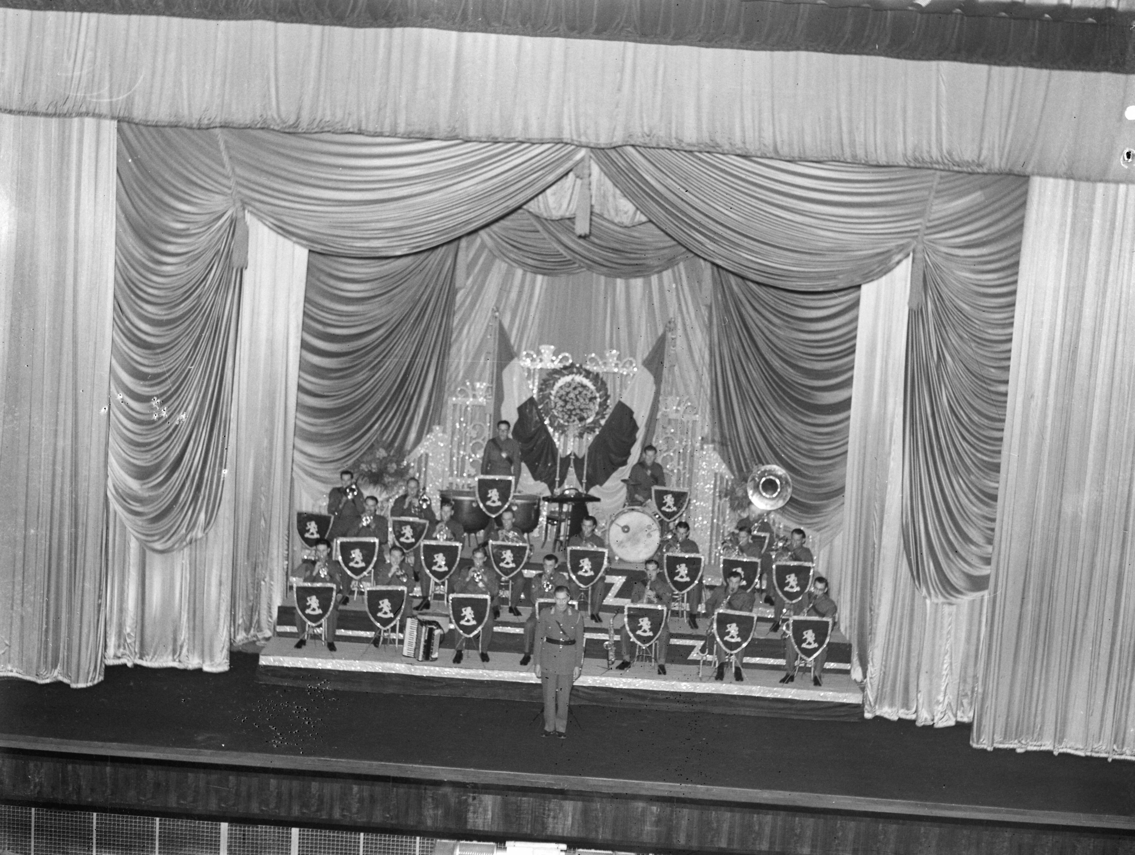 Odeon Cinema te Londen. Première van de film "Glorious Colours". Nederlands militair orkest