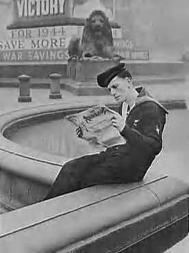 "Vrij Nederland" in Londen. Een Nederlandse matroos op verlof in Londen leest op een rustige plaats in Trafalgar Square zijn exemplaar van ""Vrij Nederland" in Londen"