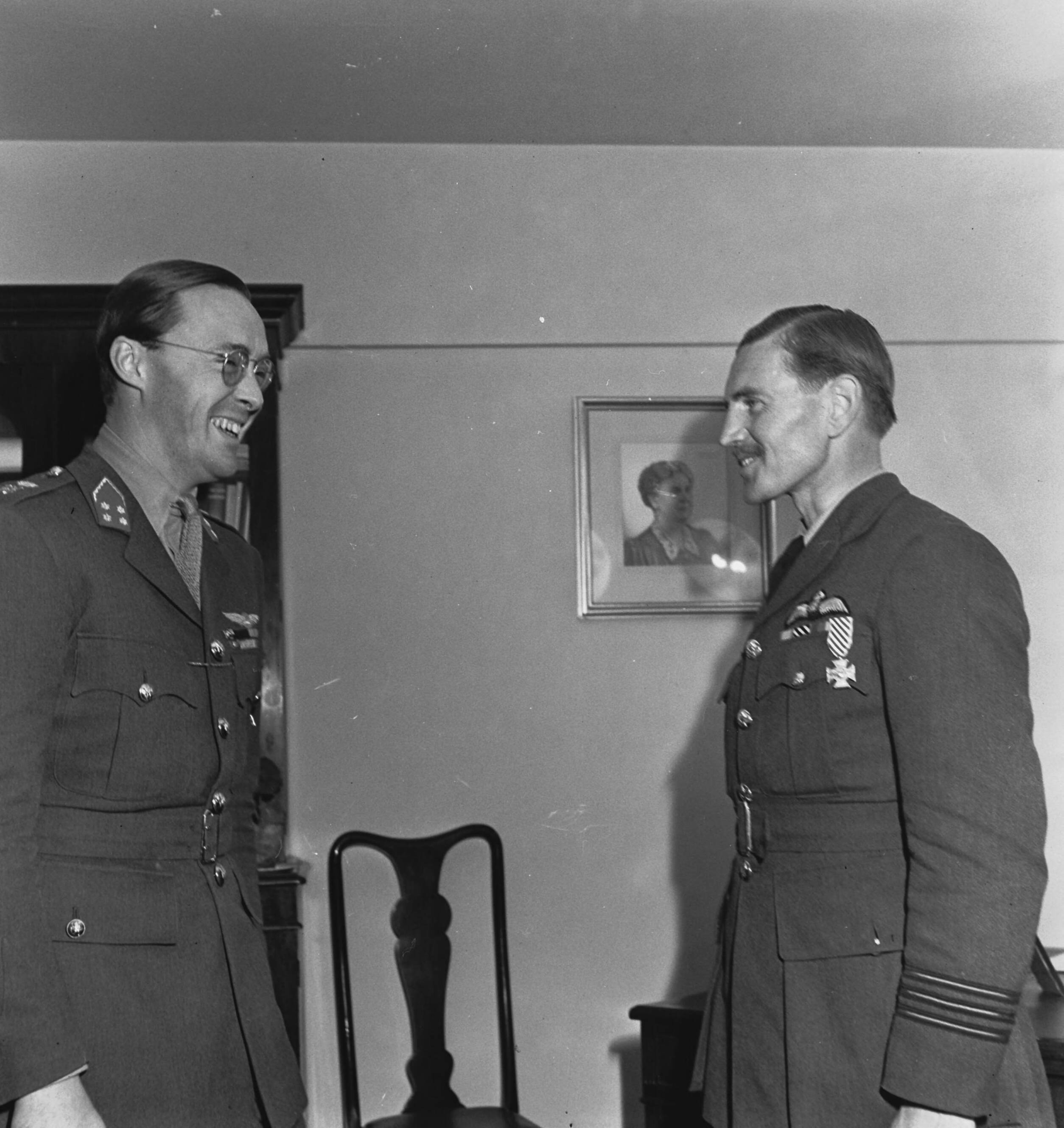 Uitreiking van het Vliegerkruis door prins Bernhard aan de Britse RAF-vlieger, Wing Commander R.N. Bateson. Bateson voerde het bevel over een formatie Mosquito-jachtbommenwerpers bij de aanval op Huize Kleykamp in Den Haag in april 1944.