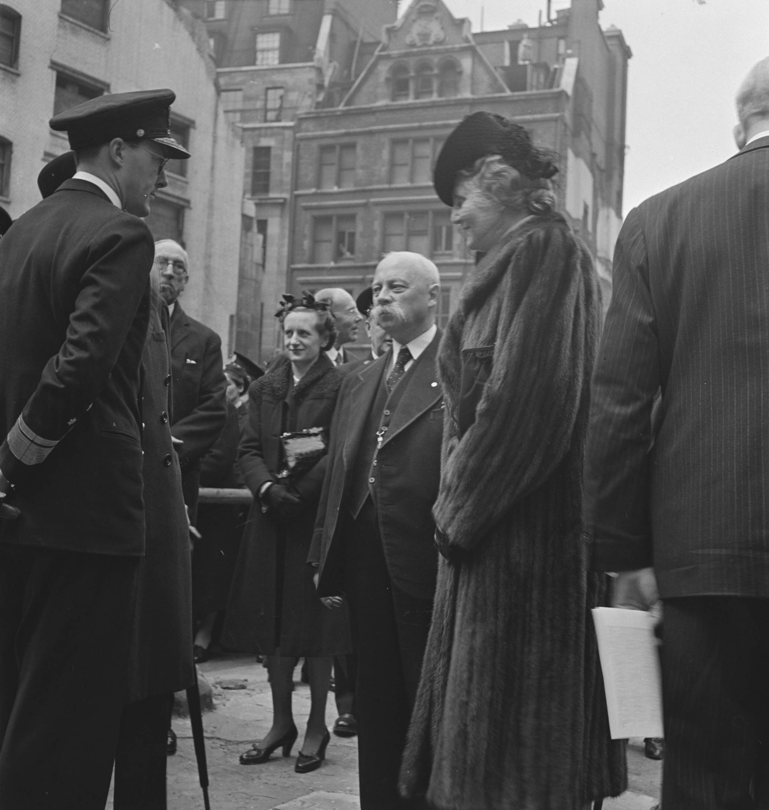 Herdenking Duitse inval in Nederland bij het verwoeste Austin Friars. Prins Bernhard in gesprek met mevrouw Michiels van Verduynen (echtgenote van de Nederlandse ambassadeur in Engeland) en minister-president Gerbrandy