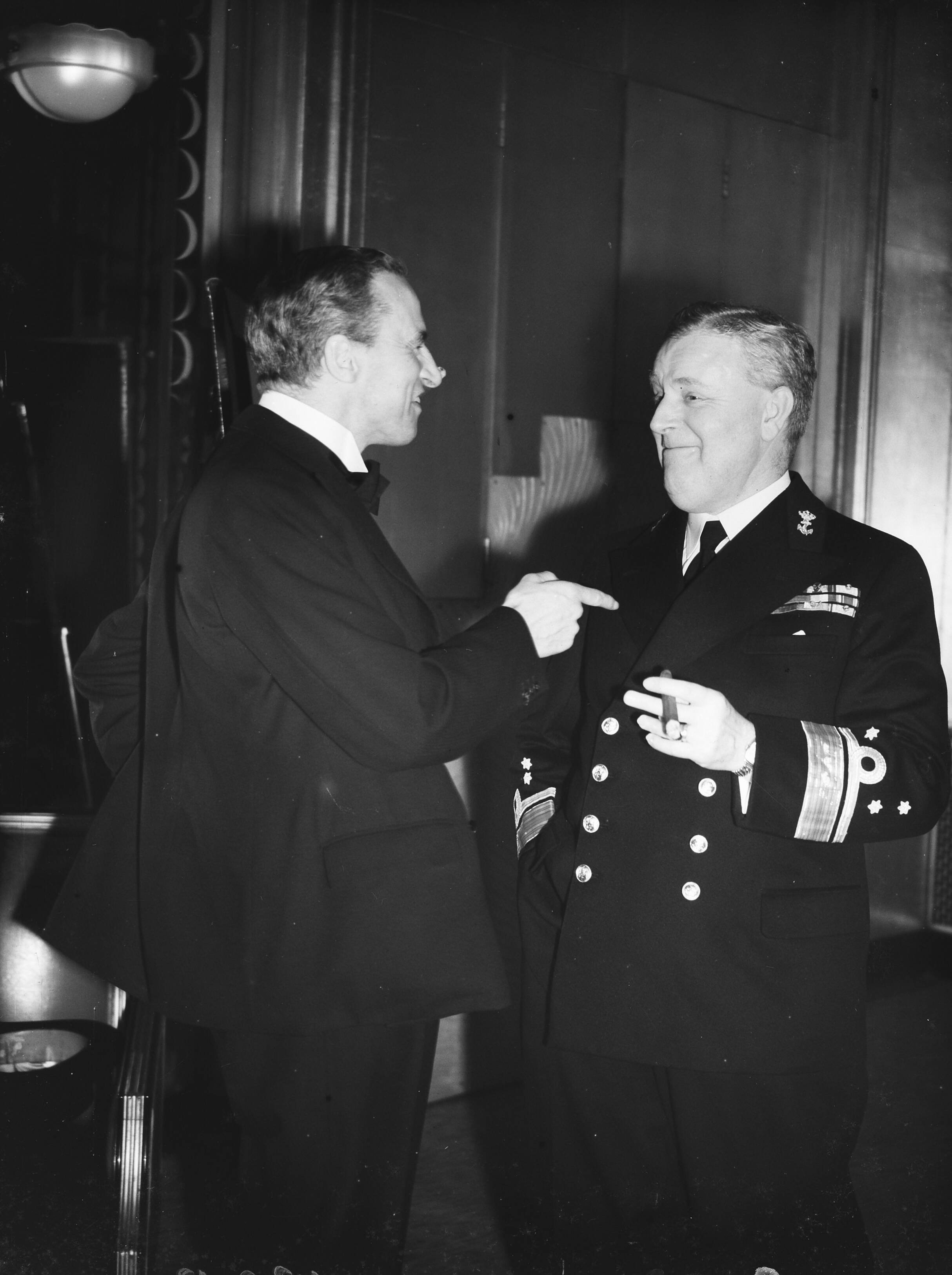 Nederlandse club "Oranjehaven" in Londen. rechts luitenant admiraal J.Th. Furstner, bevelhebber der zeestrijdkrachten en minister van Marine