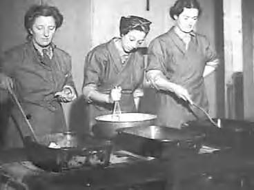 Vrouwen Hulp Korps. In de keuken zijn bezig (vlnr) Ketty Hartree, Jopie Bos-Waterman en Bep Brandhof