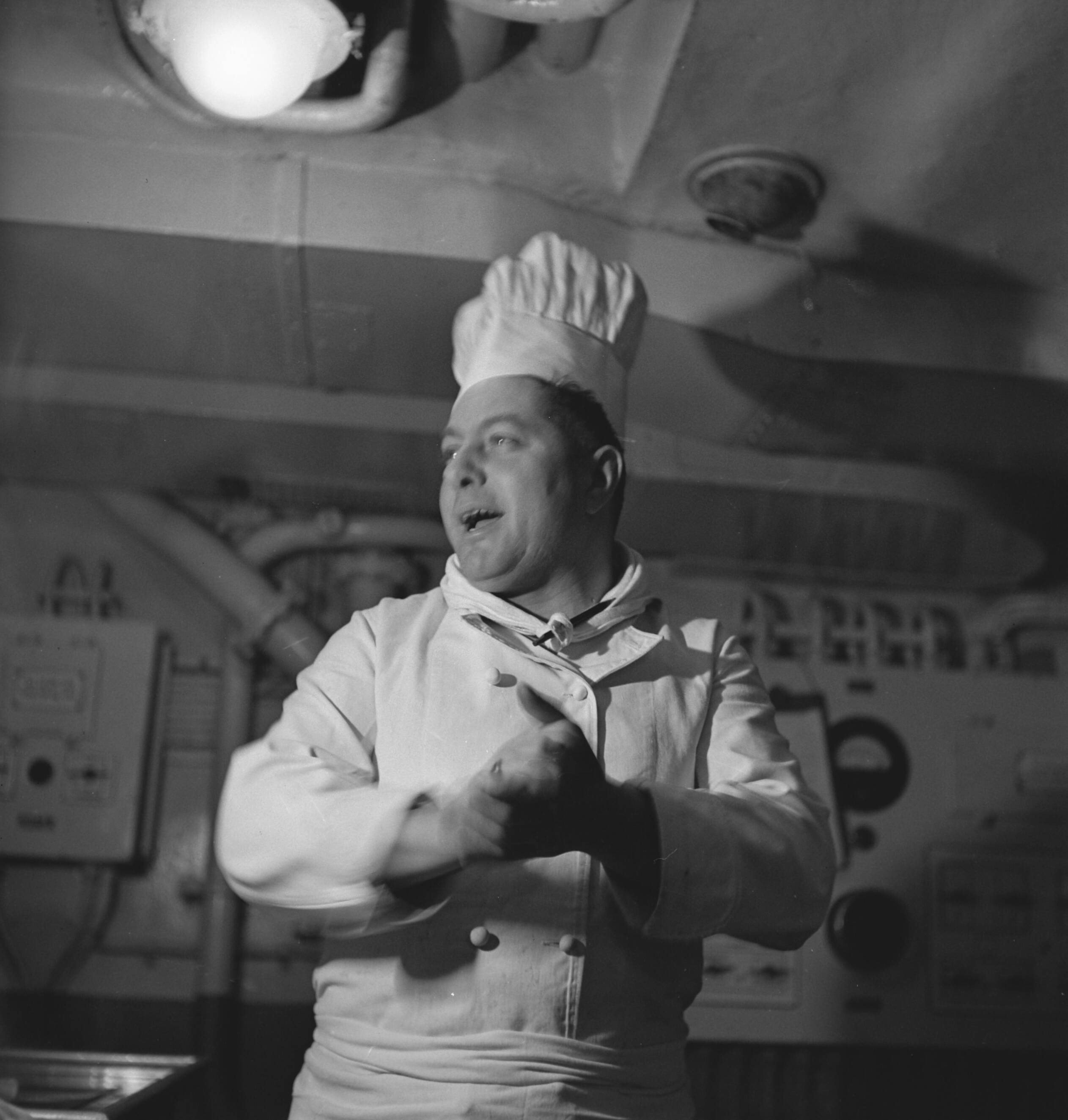 Bijschrift ""Come and get it, boys" Dutch chef on former Dutch luxury liner well satisfied with his work" Kok van Nederlands koopvaardijschip wrijft zich in de handen