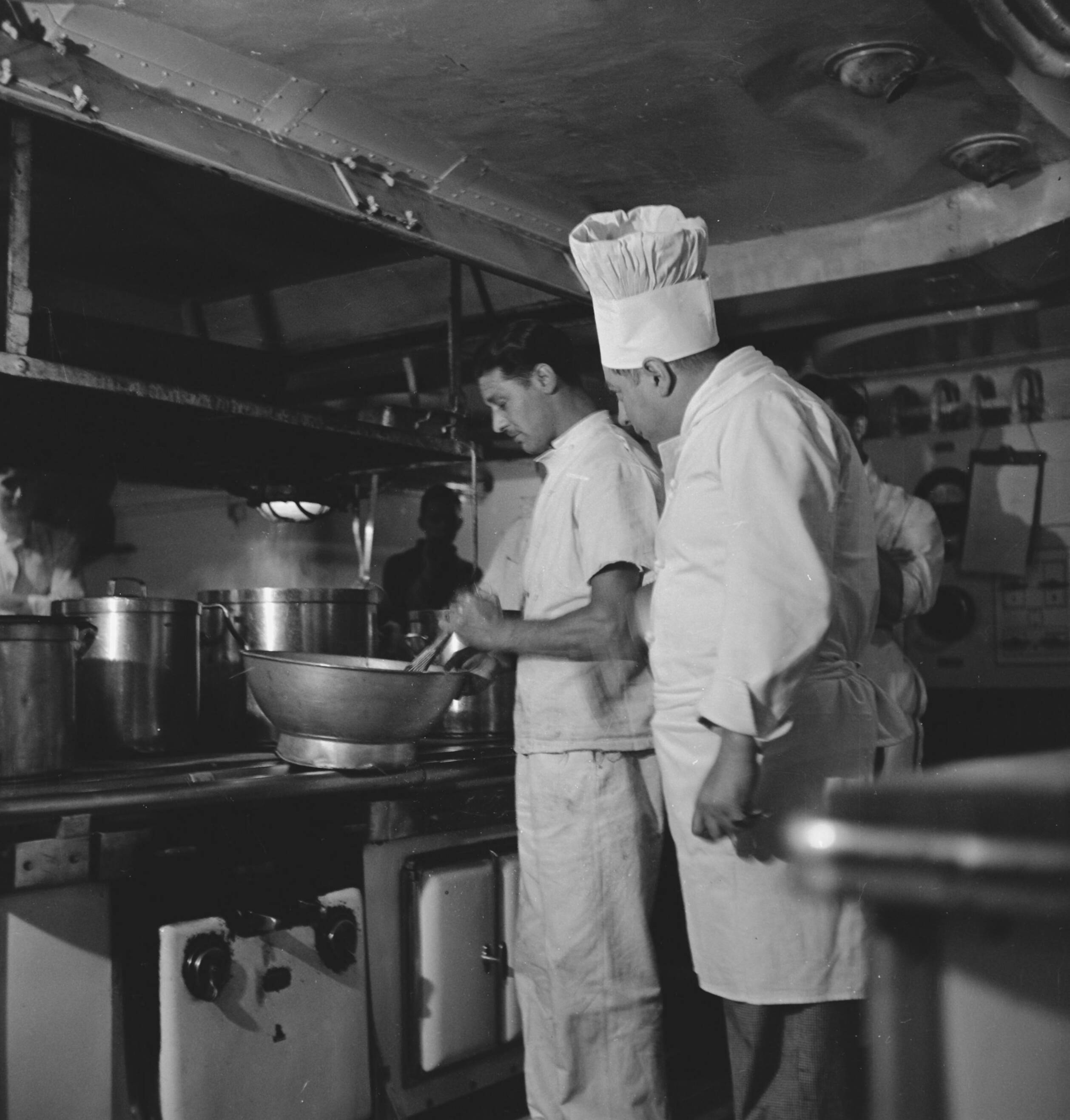Koks van Nederlands koopvaardijschip bezig in de kombuis