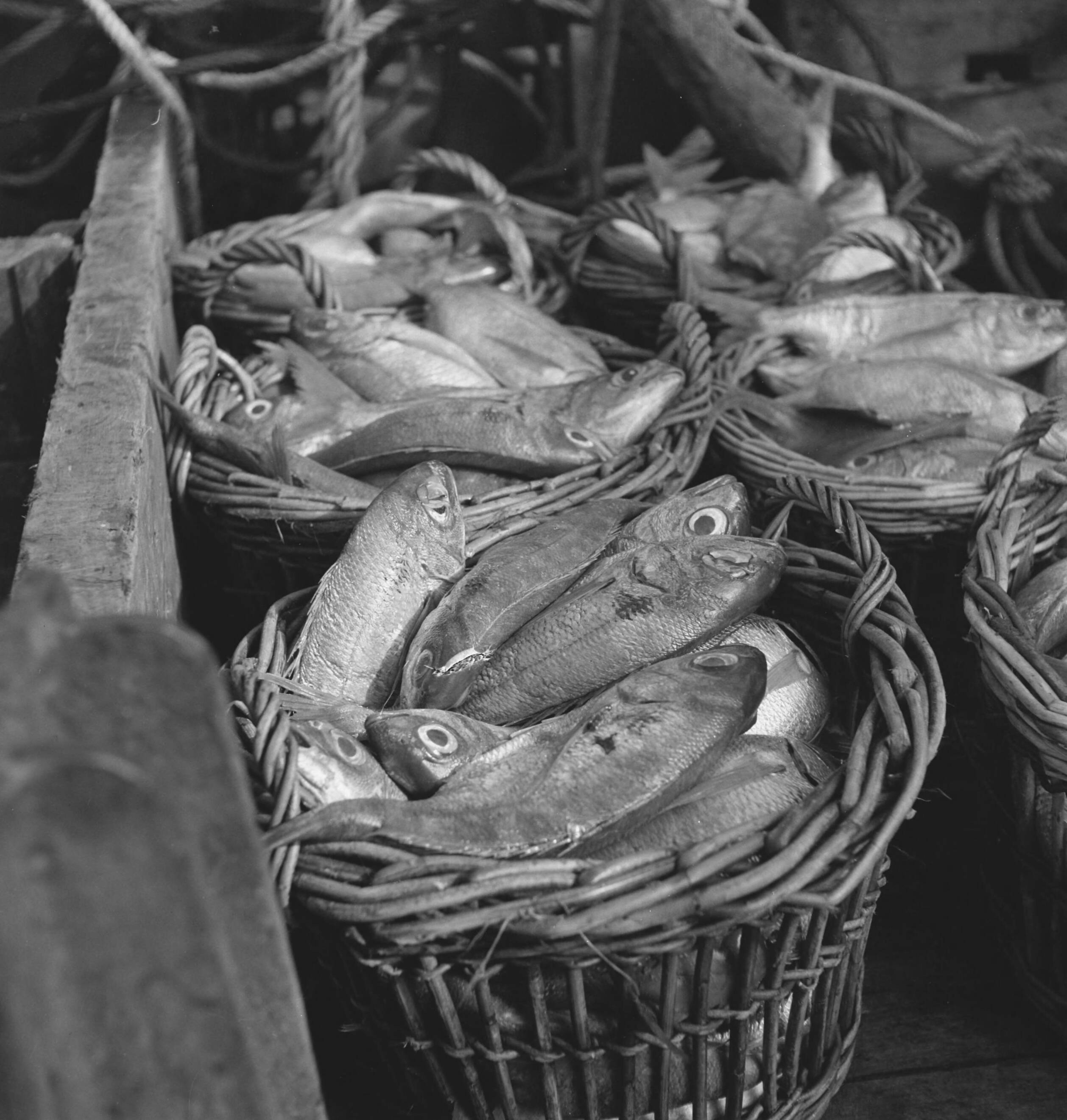 Bijschrift "On board a Dutch trawler" Aan boord van een Nederlandse vistrawler. Gevangen vis in manden