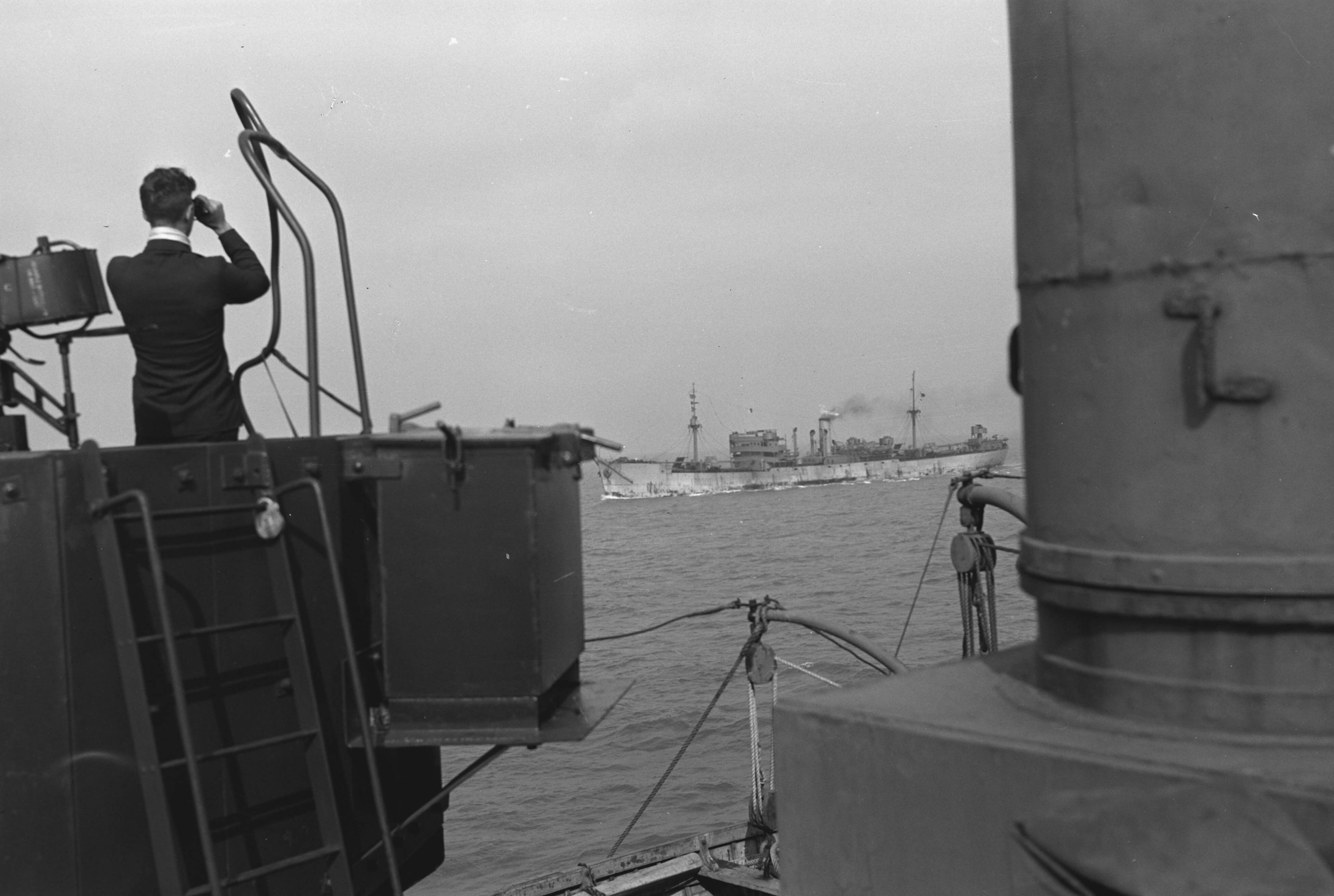 Bijschrift: "On board a Dutch tanker" Aan boord van een Nederlandse tanker