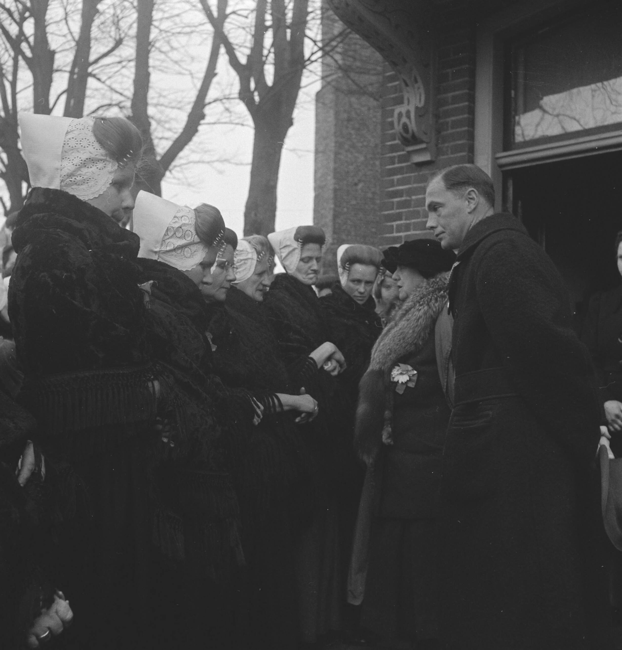 Koningin Wilhelmina in gesprek met vrouwen in Zeeuwse klederdracht