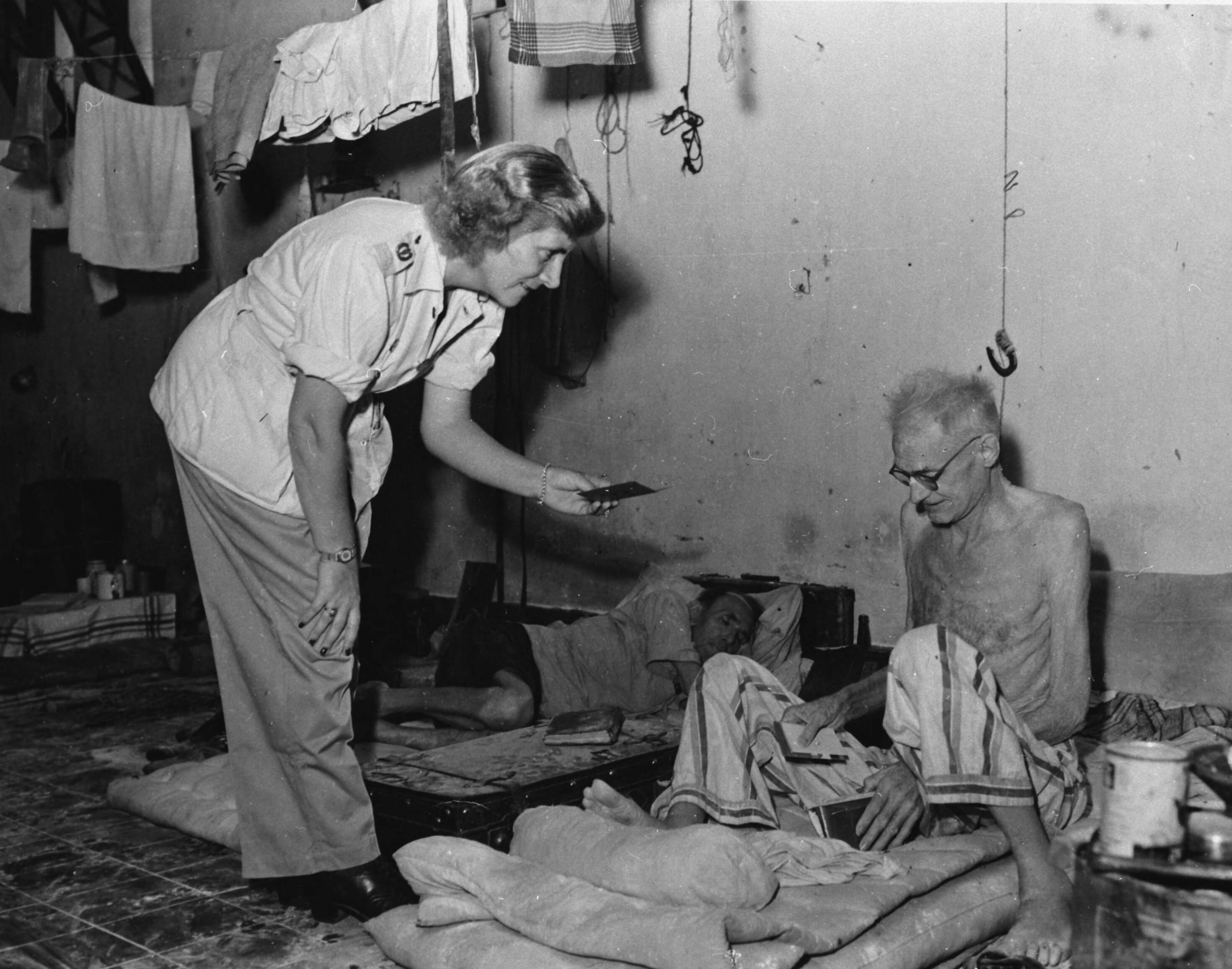 Mater dela Rosa ziekenhuis in Batavia. Zuster Jongsma met één van haar patiënten van het Mater dela Rosa ziekenhuis in Batavia, Java, waar 34 verpleegsters zorgden voor meer dan 13.000 patiënten tijdens de Japanse bezetting van Nederlands-Indië. De leefomstandigheden waren onbeschrijflijk en voedsel, indien verkrijgbaar, niet geschikt voor menselijke consumptie