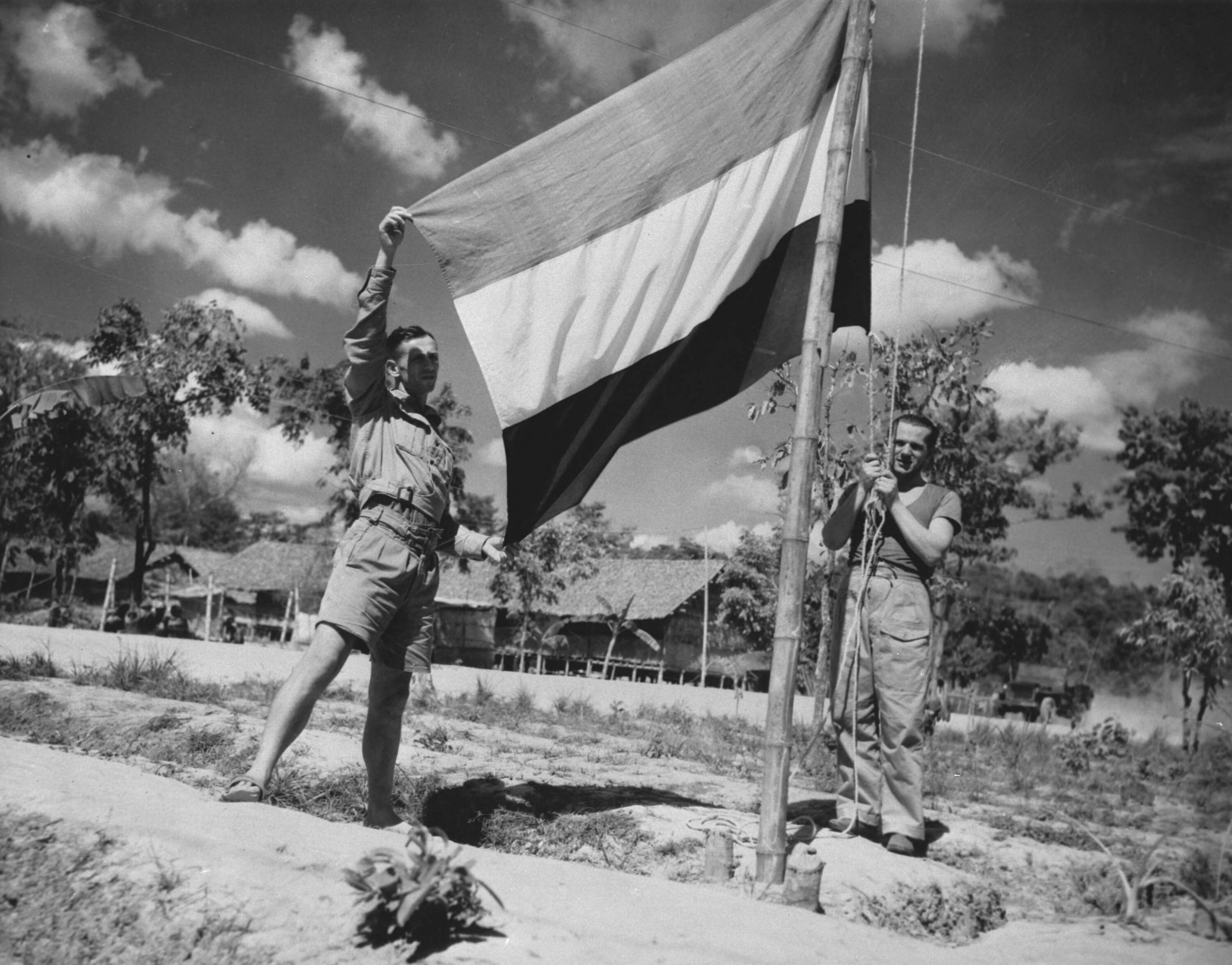 Japanse krijgsgevangenkamp Pratchai in Siam. Nederlandse vlag gehesen