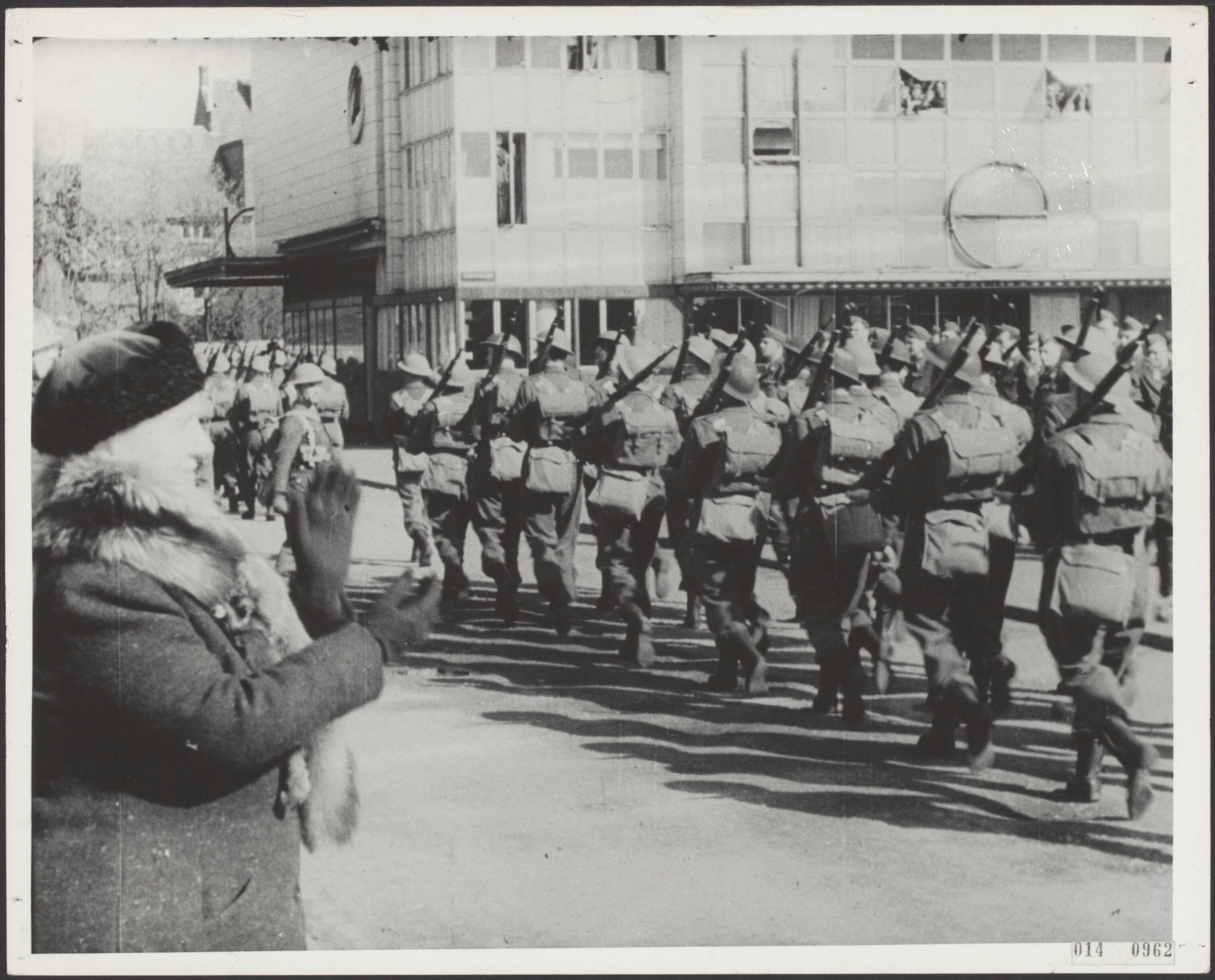 Koningin Wilhelmina tijdens haar rondreis door bevrijd Zuid-Nederland bekijkt een militaire parade op het Raadhuisplein te Heerlen