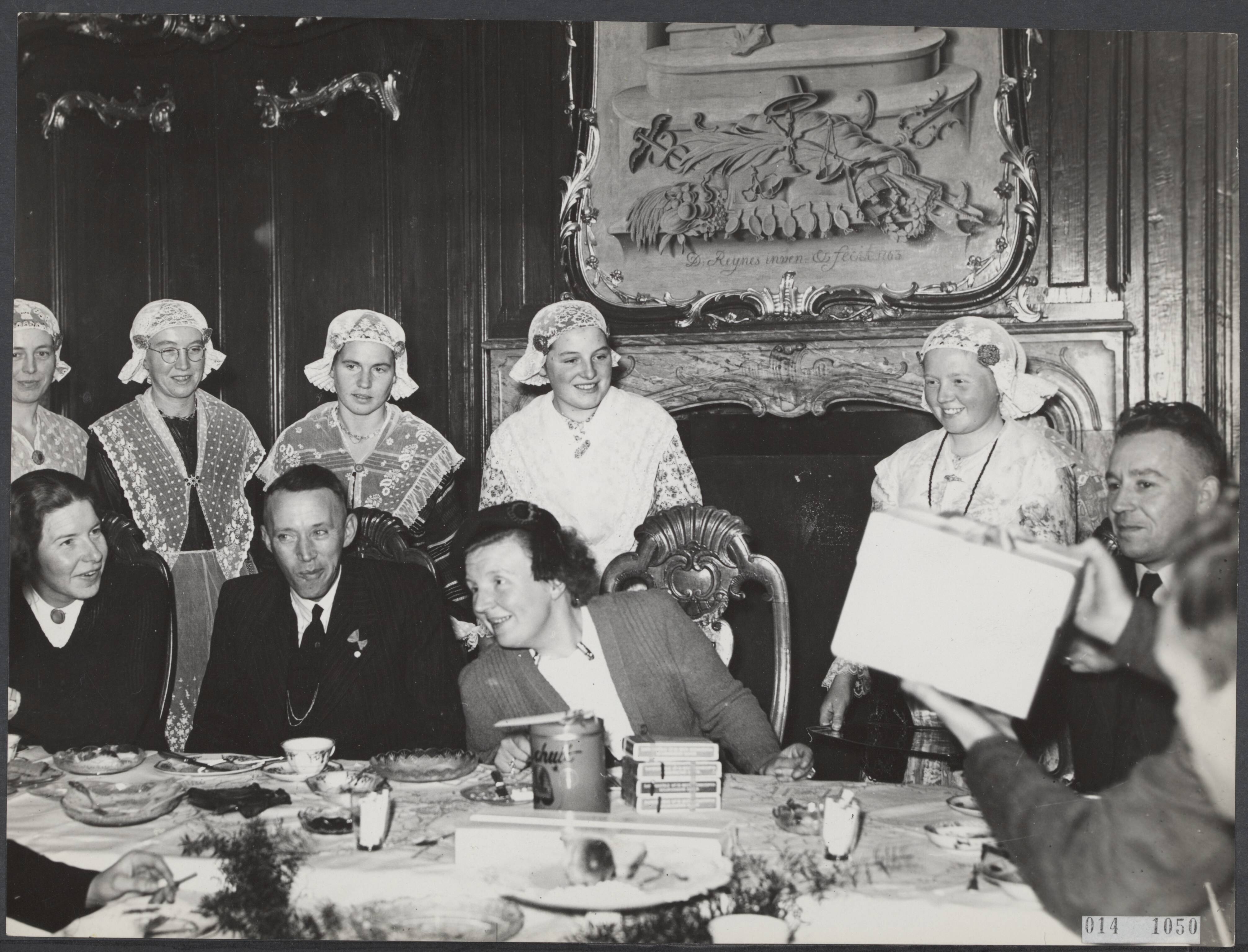 Prinses Juliana bezocht vorige week de noordeljke provincies. De prinses tijdens een maaltijd te Dokkum waar de bediening geschiedde door dames in Friese klederdracht