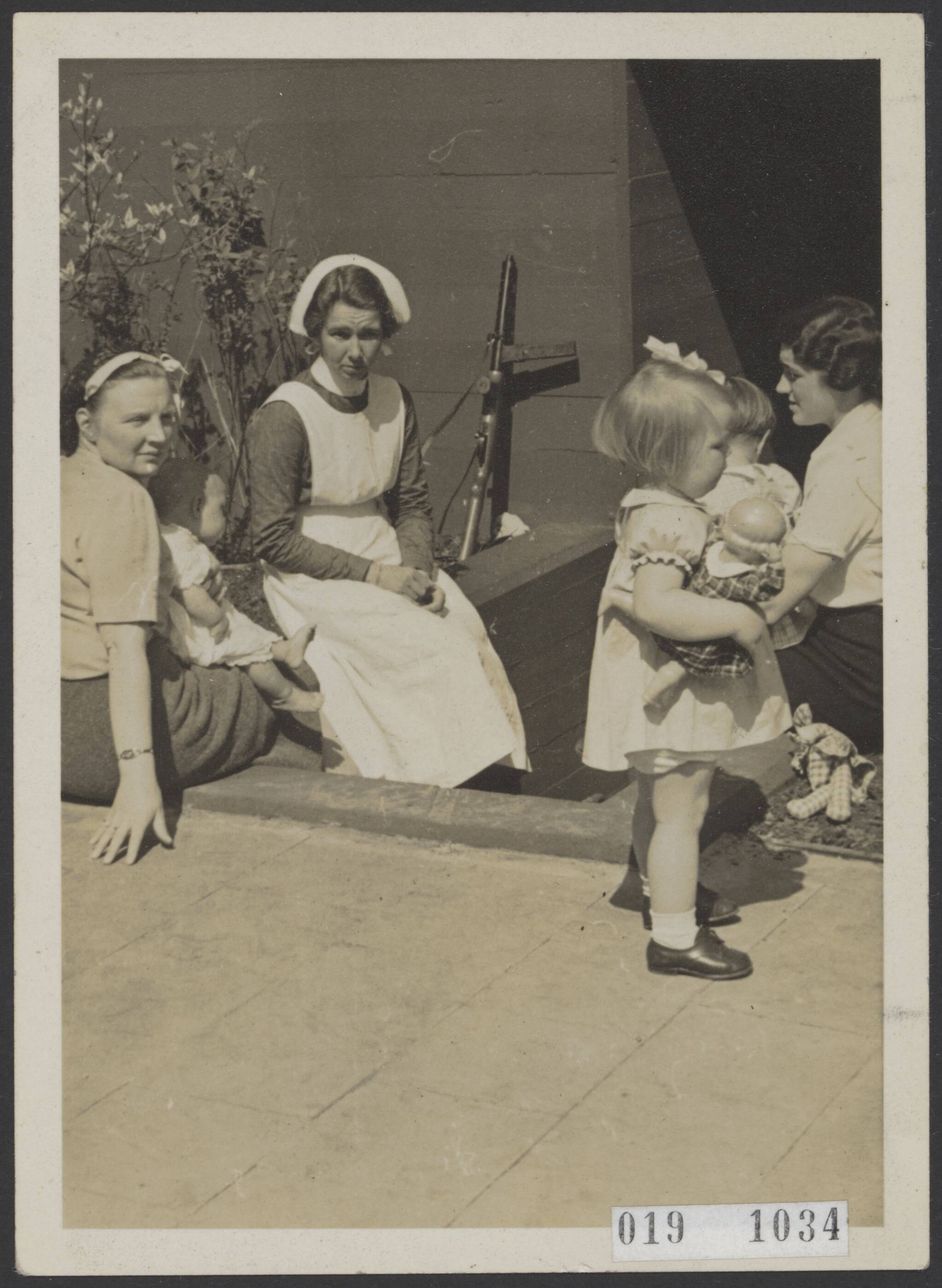 Koningin Juliana met op schoot prinses Irene, en prinses Beatrix (staand rechts) met verpleegster bij schuilkelder bij paleis Noordeinde in Den Haag tijdens de meidagen '40