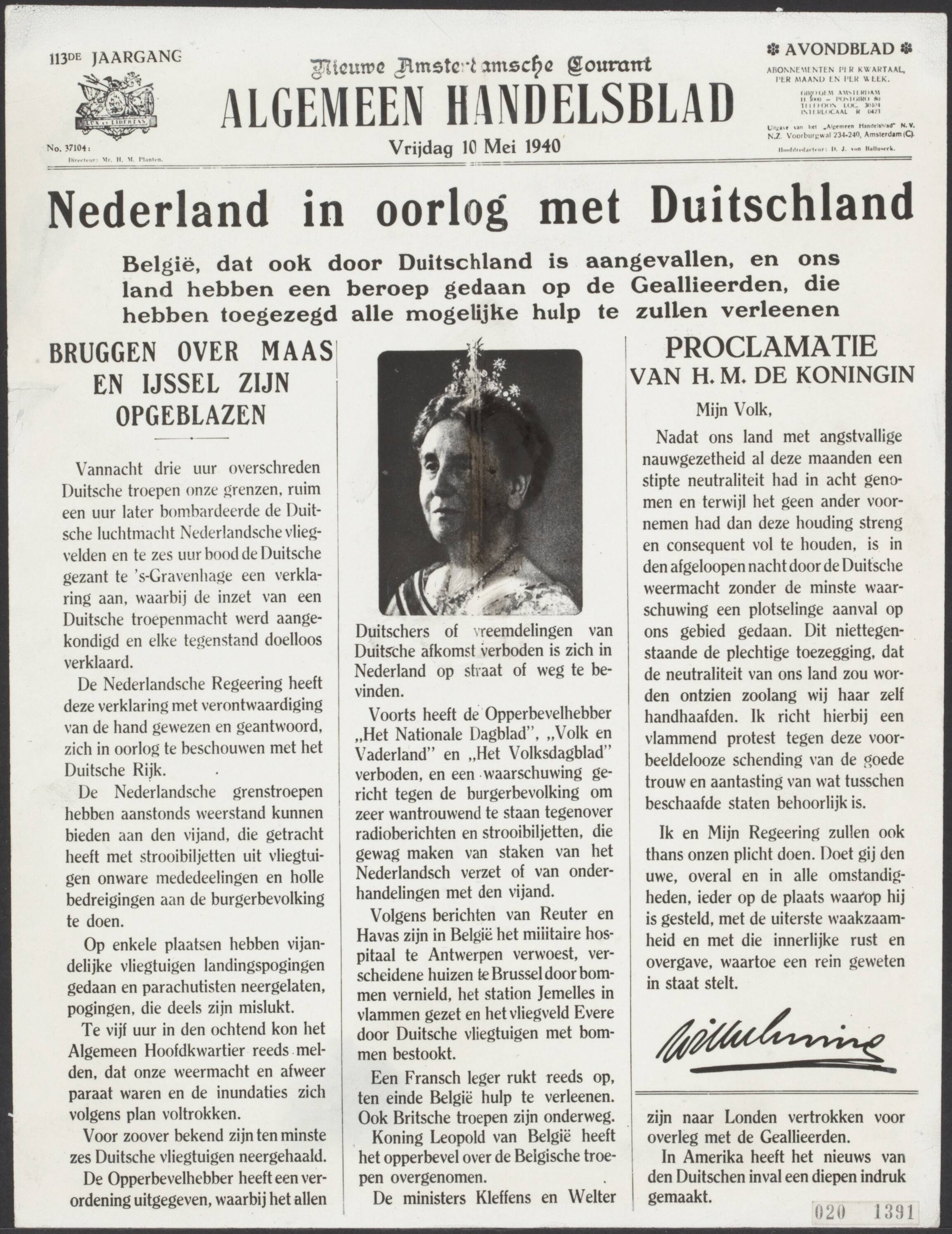 Voorpagina van het Algemeen Handelsblad Nederland in oorlog met Duitsland. Proclamatie van koningin Wilhelmina