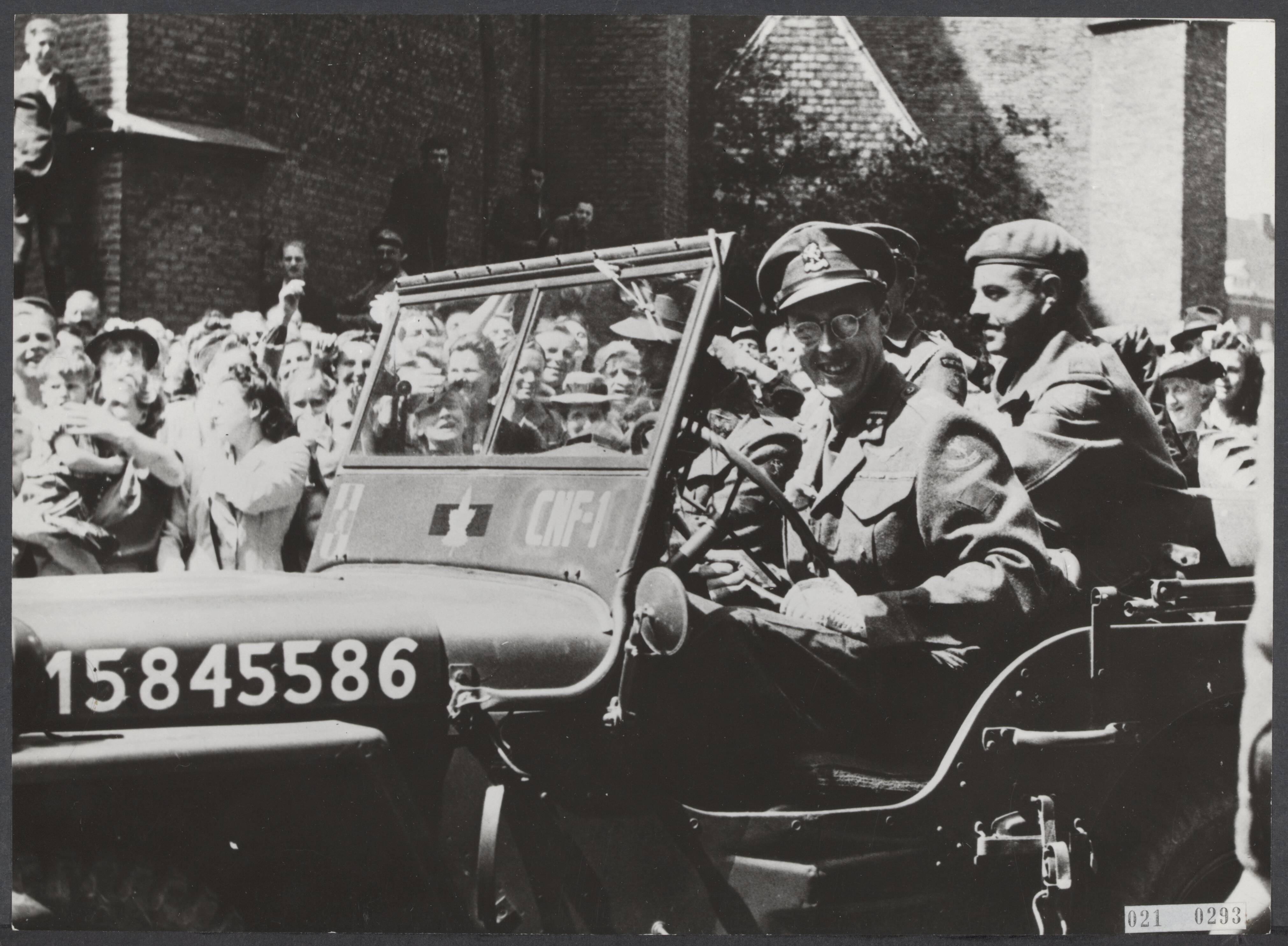 Prins Bernhard in zijn jeep voor de Grote Kerk in Den Haag