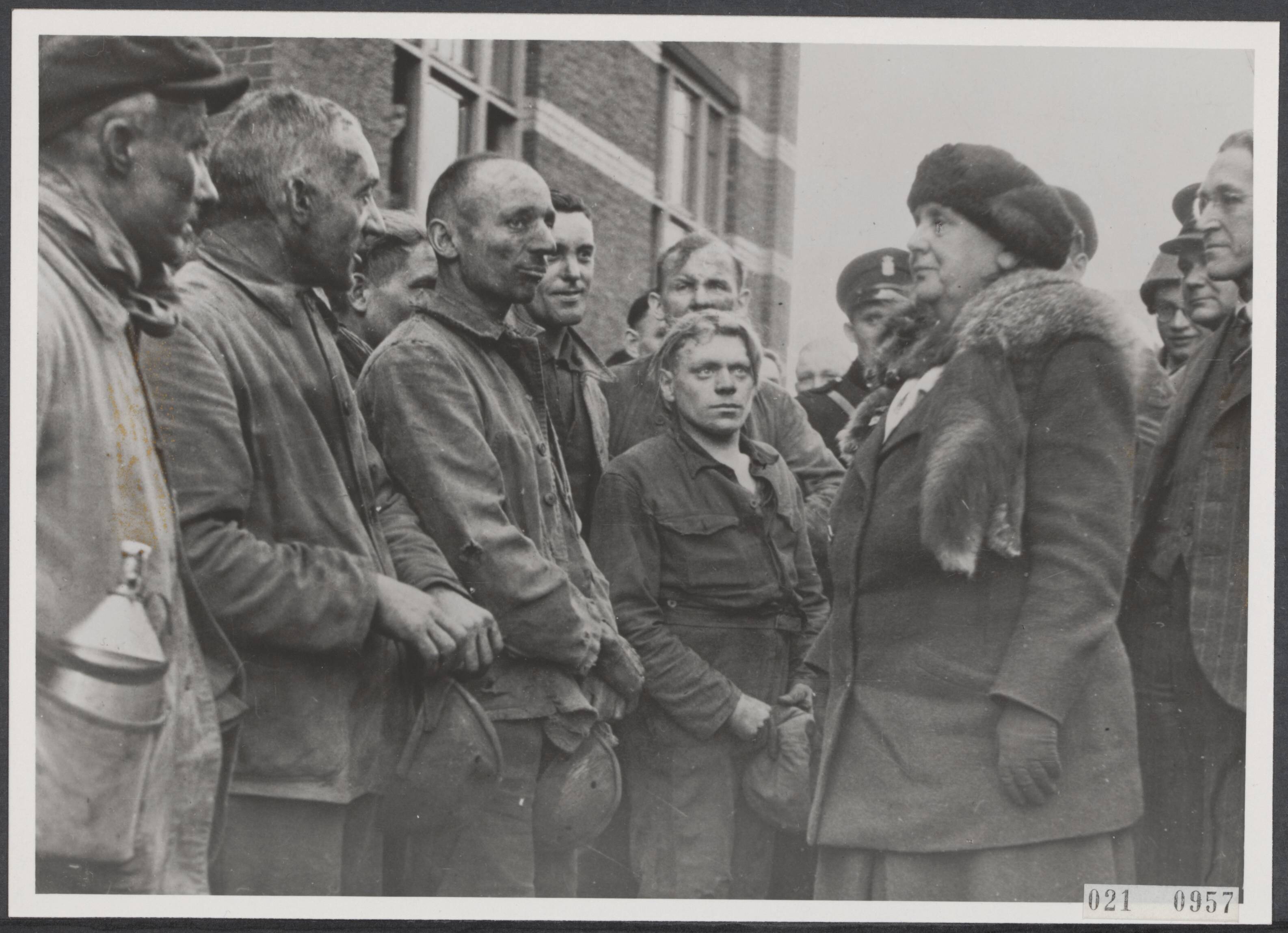 Koningin Wilhelmina in gesprek met mijnwerkers van de staatsmijn Wilhelmina in Limburg