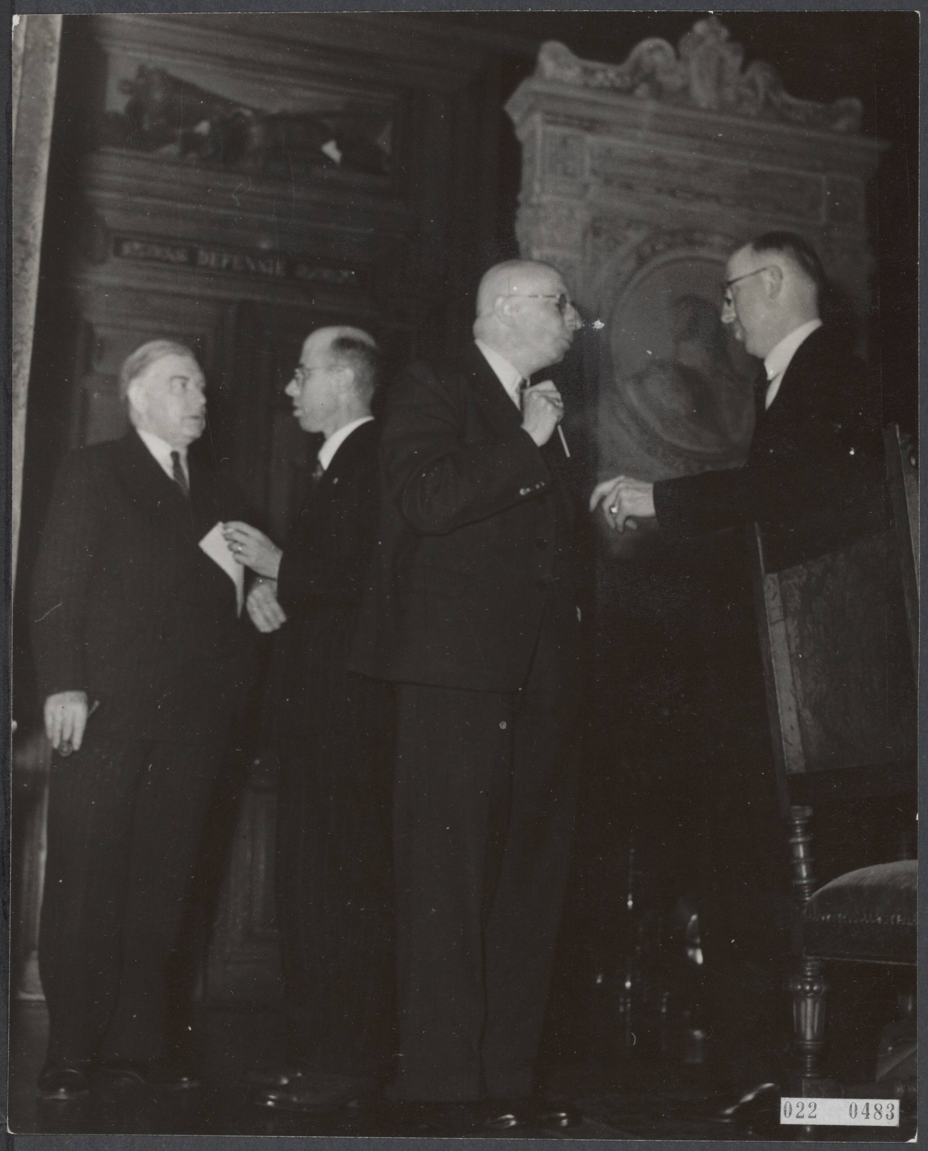 Leden van de ministerraad in gesprek. Vlnr. J.M. de Booy (Marine), dr. L.J.M. Beel (Binnenlandse Zaken), Prof. dr. G. van der Leeuw (Onderwijs, Kunsten en Wetenschappen), prof. M.P. Lieftinck (Financiën)