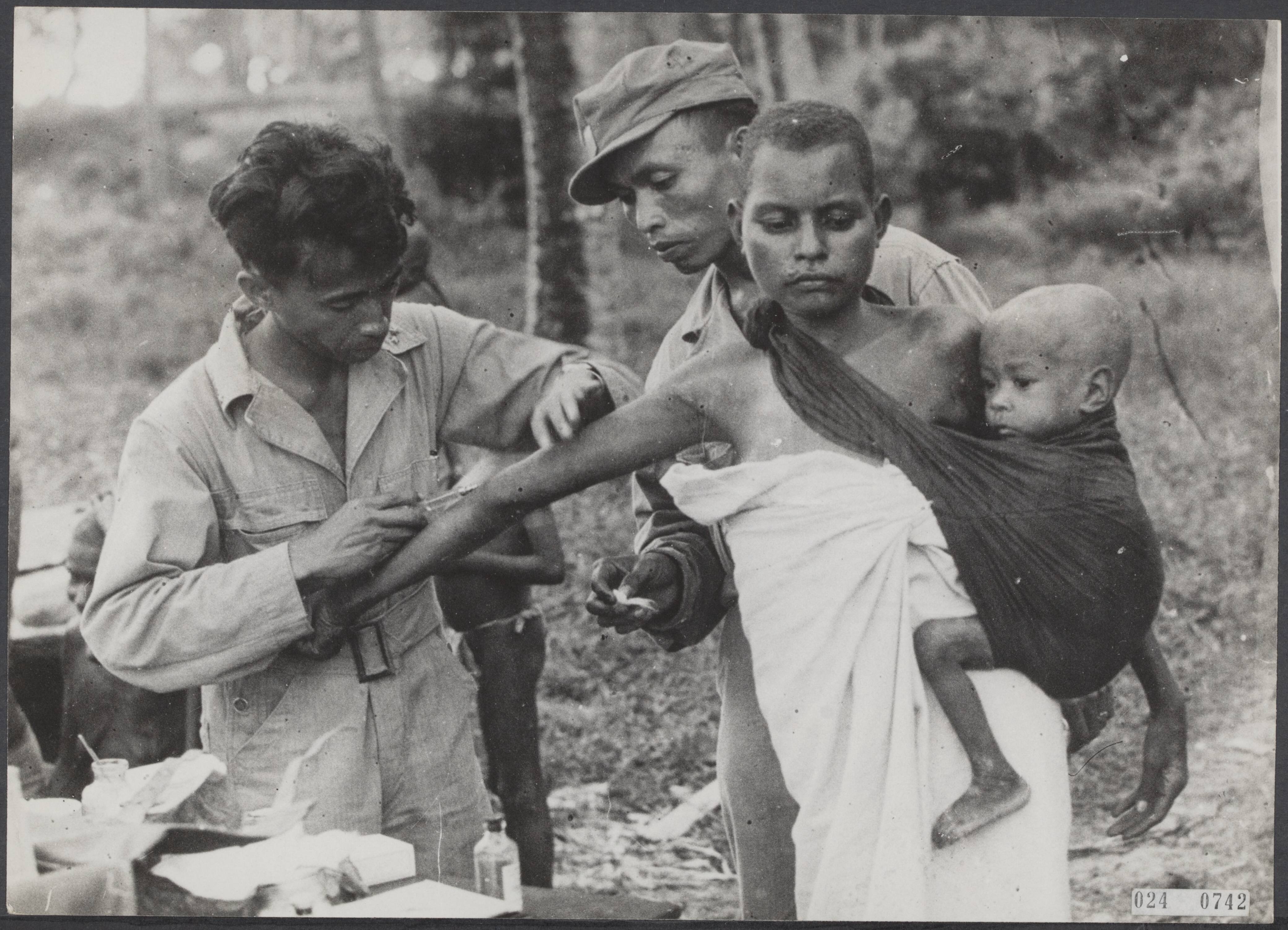 Leden van de medische afdeling van de NICA (Netherlands Indies Civil Administration) geven de Indonesiërs injecties tegen besmettelijke ziekten