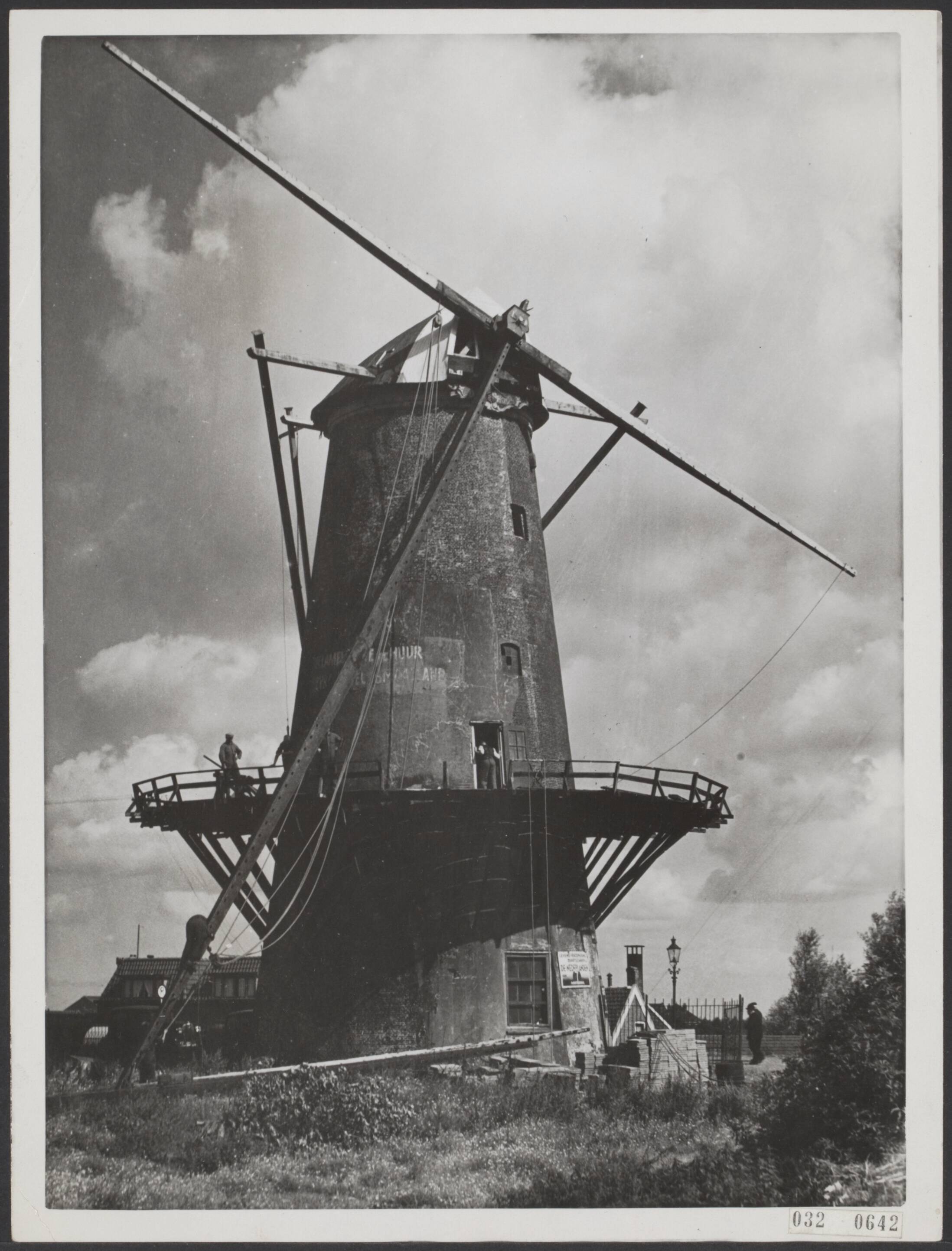 Molen De Hoop te Maassluis wordt gerestaureerd. De kap is reeds hersteld en nieuwe wieken zullen weldra door de lucht draaien. Een van de nieuwe wieken wordt opgehesen om op zijn plaats te worden gericht