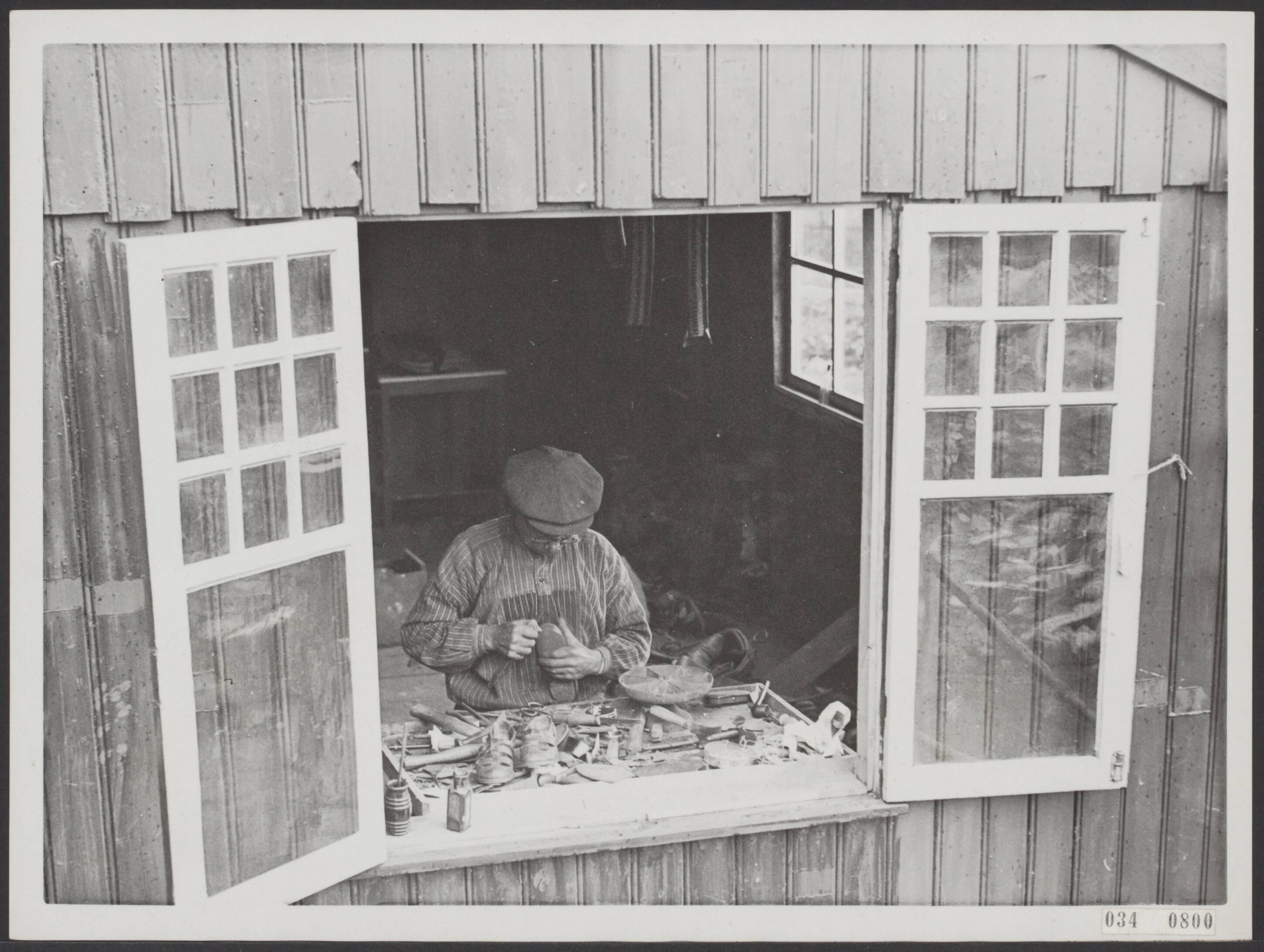 Bijschrift "Het Eemland herstelt zich, en overal slaat men de handen aan de ploeg. Hoogland, het rustige dorpje onder de rook van Amersfoort, is bezig met zich de ontworstelen aan de ledigheid, waarin zij door het korte, maar hevige oorlogsgeweld werd geplaatst. Naast de puinhopen van zijn oude woning ziet men de schoenmaker weer aan het lappen in een snel gebouwde houten loods"