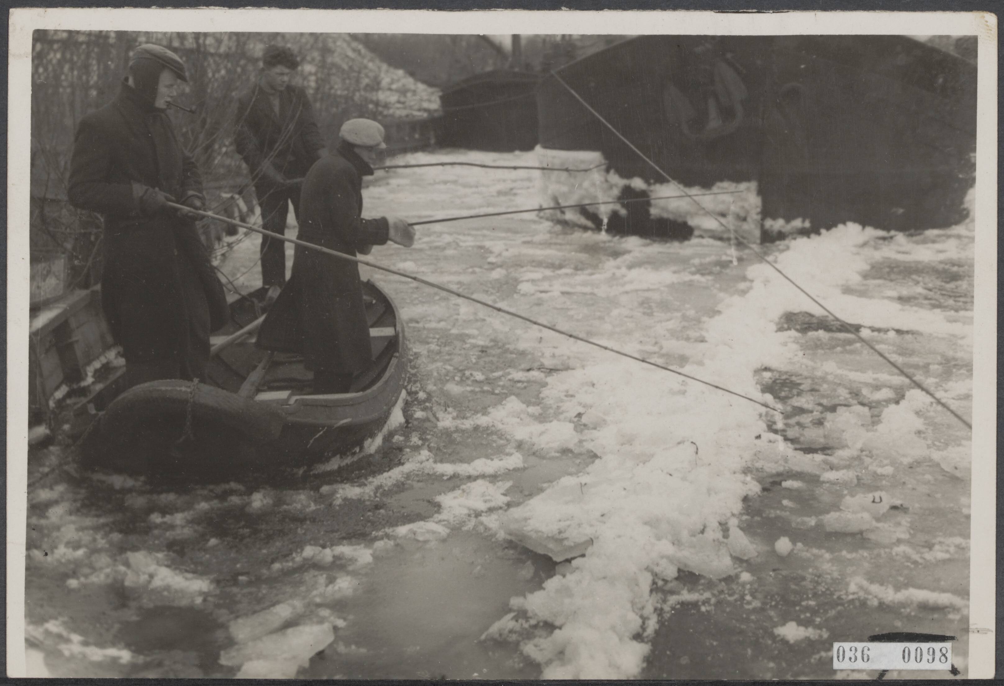 "Een man blijft op zijn post... Hengelaars laten zich door de felle koude niet afschrikken, zij hakken een gat in het ijs en laten het snoer met het aas zakken in de hoop enige vissen te vangen die het straks in de braadpan warmer zullen hebben dan in het water. Enige hengelaars langs de Waal."