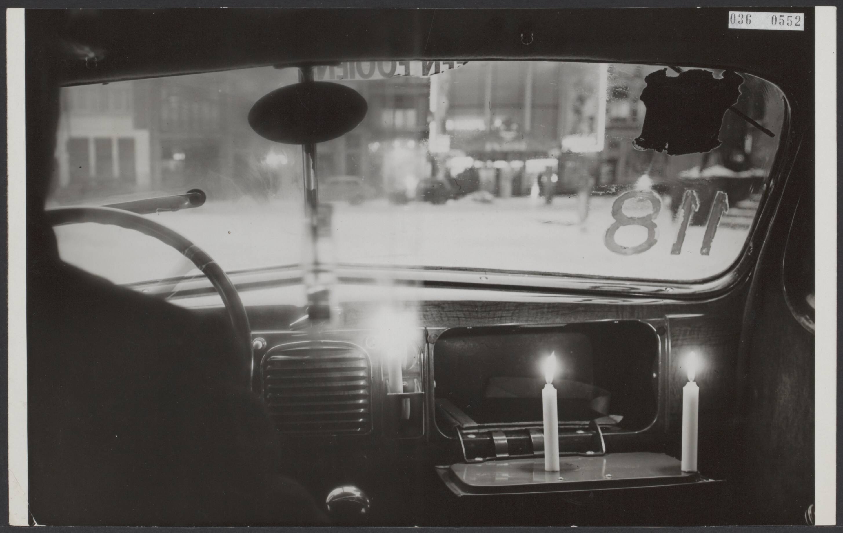 Bijschrift "Om het bevriezen der ruiten tegen te gaan, plaatsen de chauffeurs er brandende kaarsen bij"