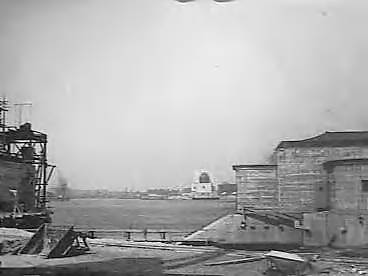 Overzicht van de stand van de werkzaamheden. Links het ventilatiegebouw, rechts het roltrappengebouw op de linker Maasoever. Op de achtergrond (de rechter Maasoever) de tweede windtunnel (ventilatiegebouw)