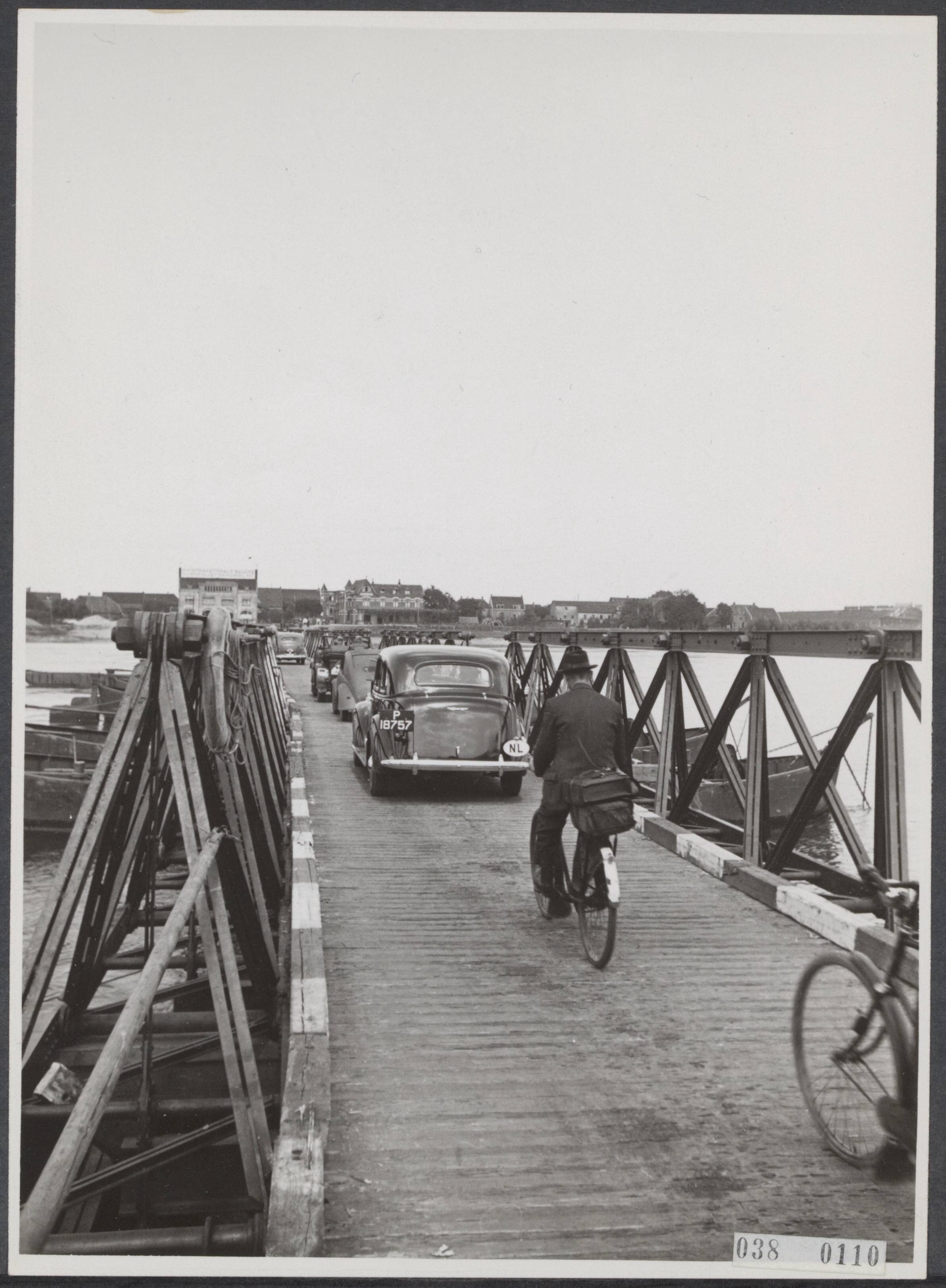 Bijschrift "Gezien de bruggen over de Waal bij Nijmegen onbruikbaar zijn, hebben de Duitse pioniers deze zware tijdelijke brug aldaar geslagen, waarover heel het verkeer wordt geleidt"