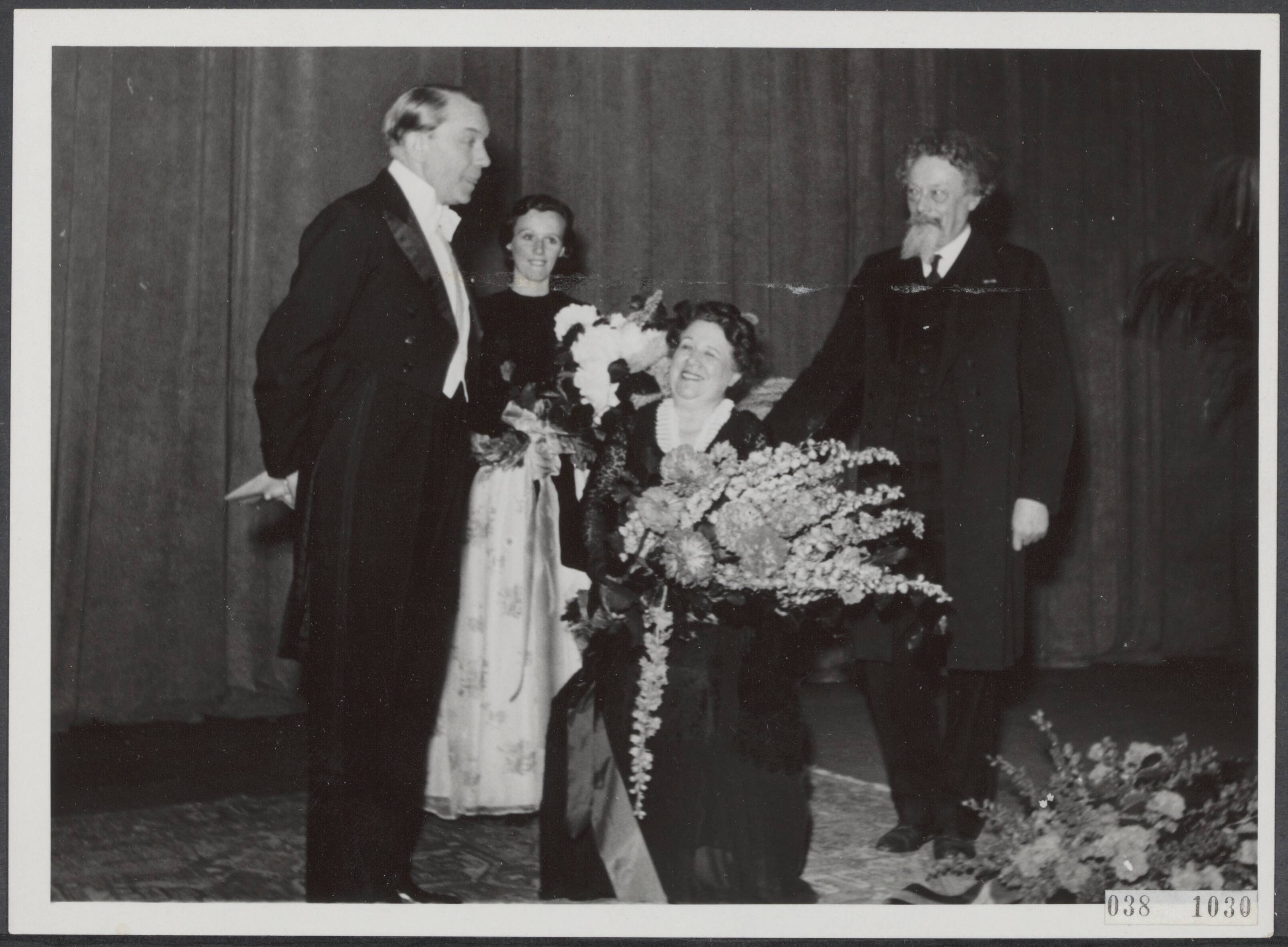 In de Stadschouwburg te Amsterdam vond donderdagavond een jubileumvoorstelling plaats van Koos Speenhoff. Cor van der Lugt-Melsert spreekt de jubilaris en zijn echtgenote toe
