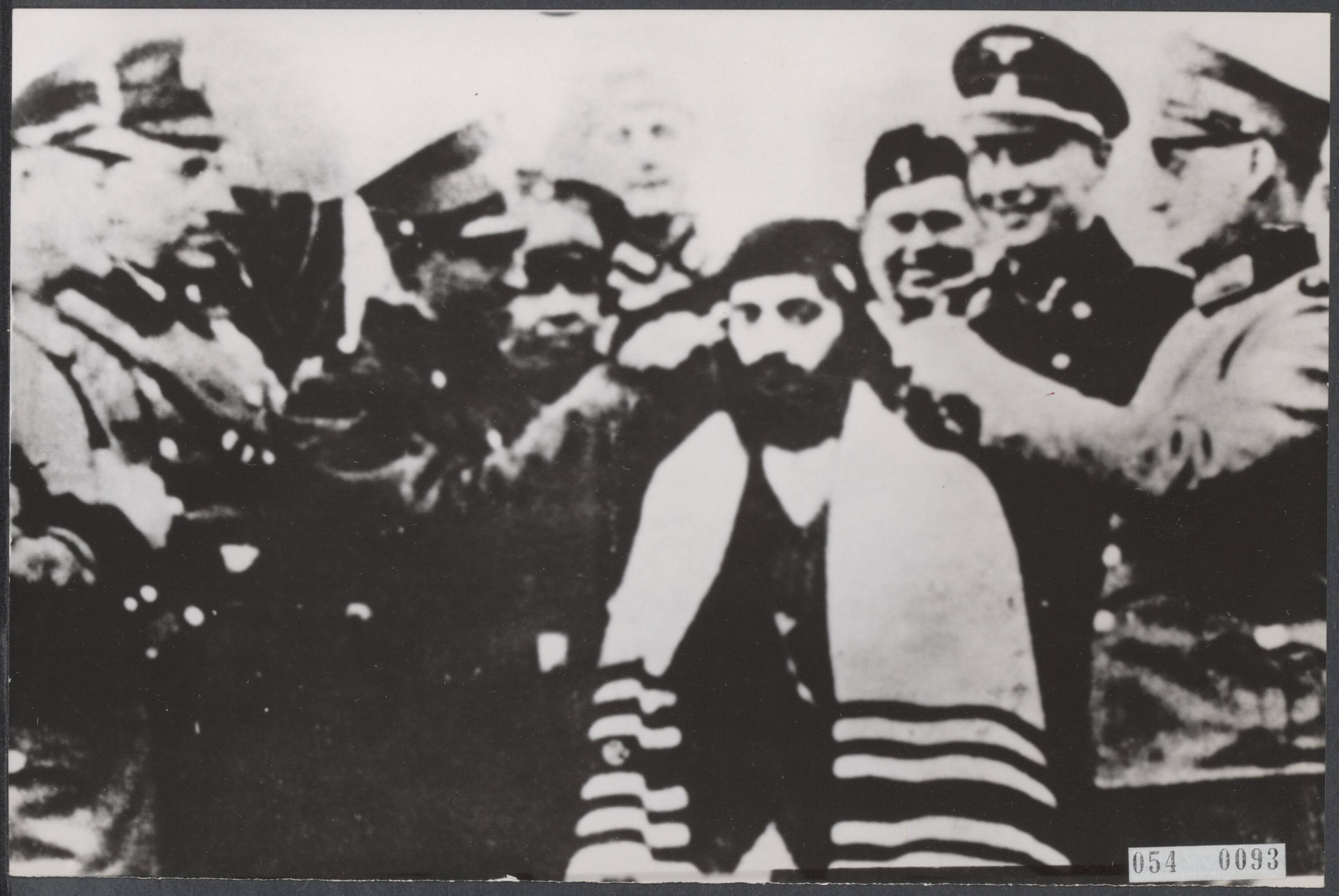 Proces Adolf Eichmann. Foto van Adolf Eichmann in het concentratiekamp Bergen Belsen. Eichmann (2e van rechts) kijkt vergenoegd toe als twee andere Duitse officieren bij een oude Joodse gevangene de haren afsnijden. Een Duitse soldaat zou deze foto gemaakt hebben en werd gevonden bij een Duitse krijgsgevangen, toen het kamp op 15 april 1945 door Engelse militairen werd bezet