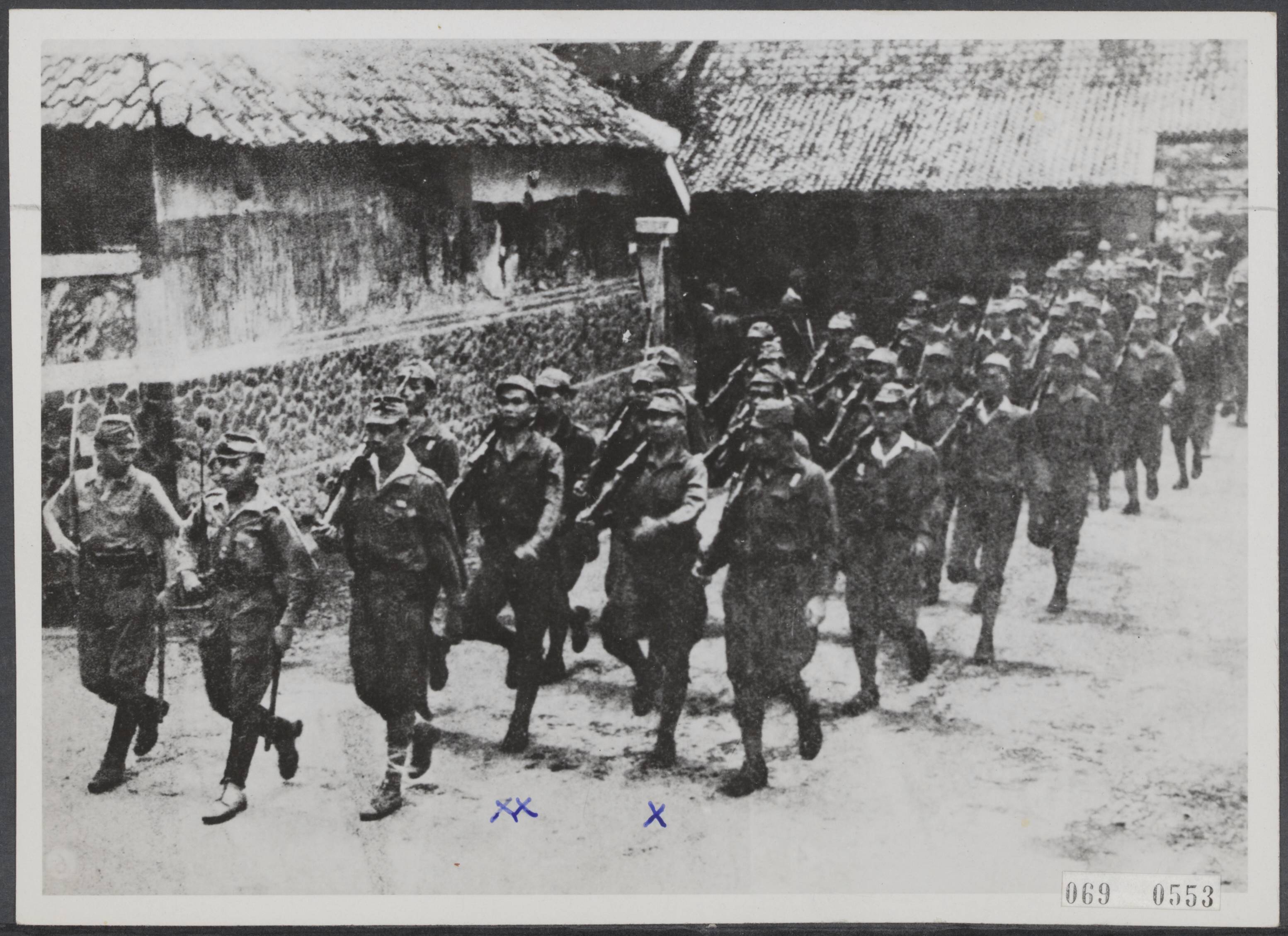 Bijschrift "Een Japanse foto. Ir Soekarno (kruisje) en alle leden van de Japanse 'Volksraad' op Java ontvangen vrijwillig militaire opleiding onder leiding van een Japanse officier (uiterst links). De 'Volksraad'-leden marcheren een kazerne in Batavia uit. De Indonesische Goebbels, R. Soekardjo Wirjapranoto (2 kruisjes). Zo werd er reclame gemaakt voor dienstneming bij de Japanse strijdkrachten, als soldaat of koelie. 120.000 Indonesiërs gingen..."