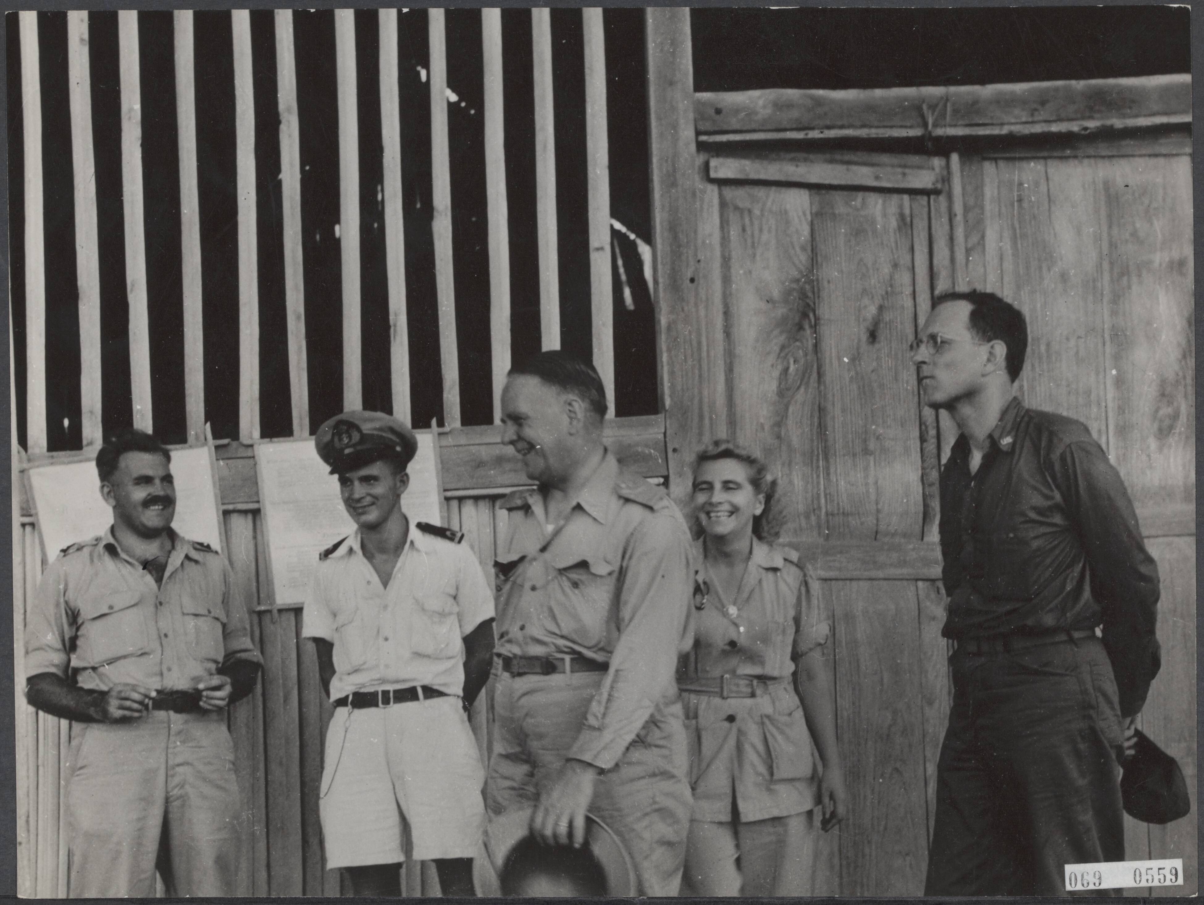 Hoge militaire en burgerlijke autoriteiten bezoeken Hollandia (Nieuw-Guinea) Adjudant S. Struikema, 2e luitenant J. Feldbusch, mr. Kerstens, Zuster Jongema en mr. Moffatt te Ifaar aan het meer van Sentani