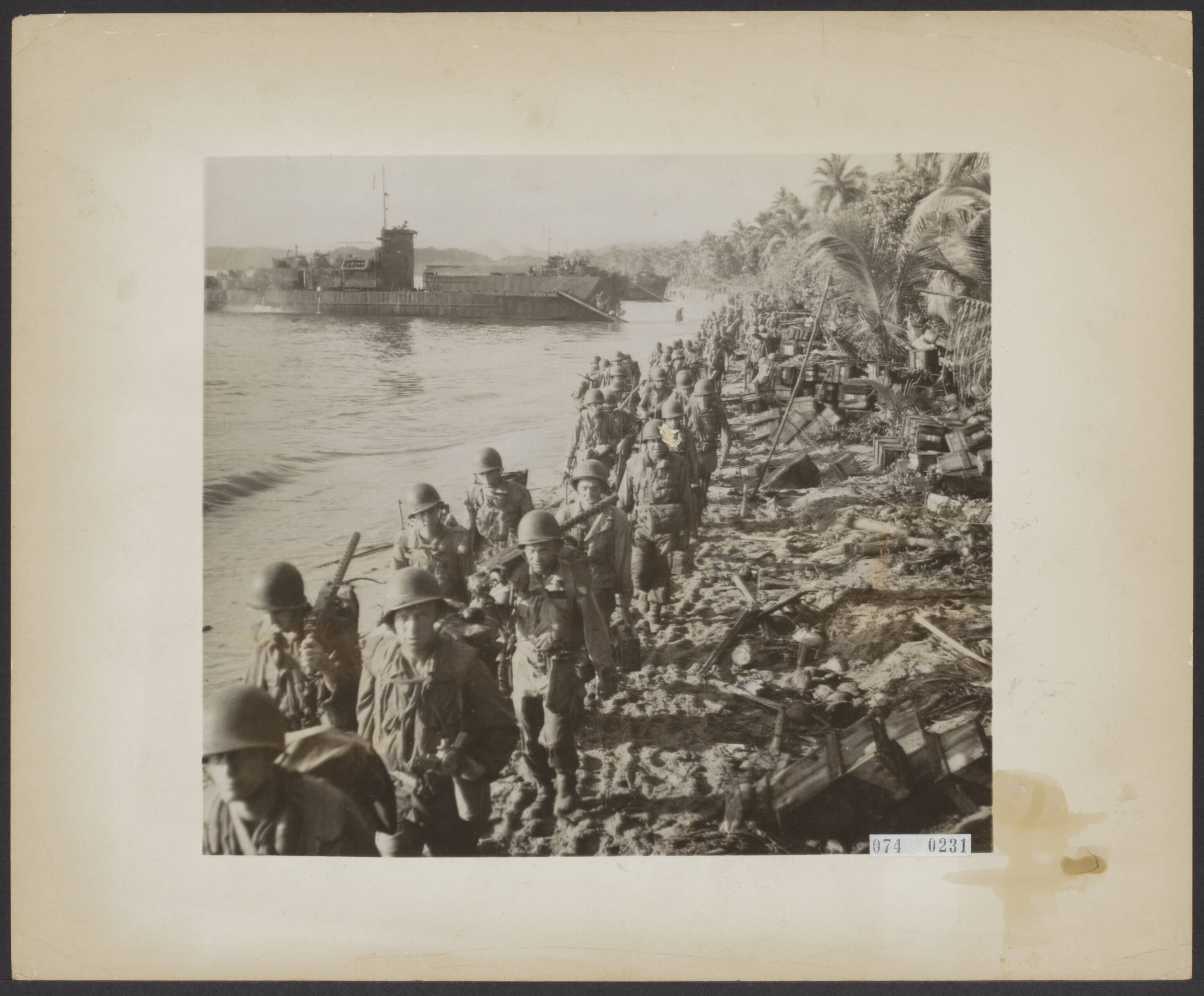 Liberation of Hollandia (New Guinea). Along a beach littered with the remains of blasted Japanese dumps, file Allied soldiers, who succesfully attacked Japanese-held Hollandia </lb> Bevrijding van Hollandia (Nieuw-Guinea). Langs een strand, bezaaid met de resten van ontplofte Japanse voorraden, marcheren geallieerde militairen in een rij