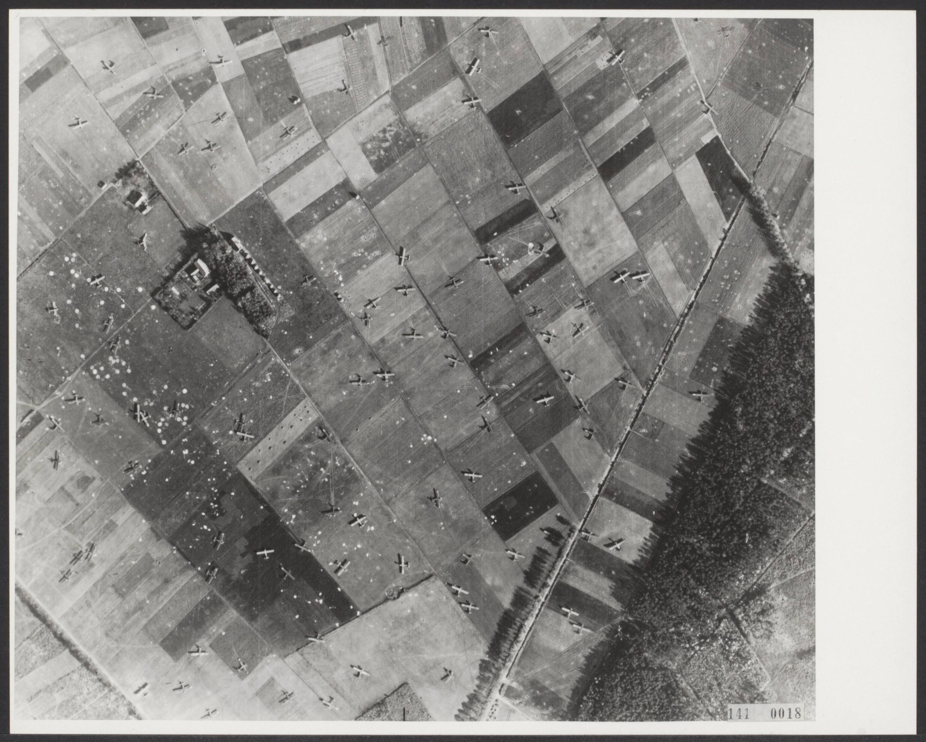 Luchtopname Operatie Market GardenNijmegen. Luchtlandingen van de 82ste Amerikaanse Luchtlandingsdivisie ten zuiden van Nijmegen in het gebied rond Groesbeek. Achtergelaten parachutes en zweefvliegtuigen op de Knapheide en Klein-Amerika ten zuiden van Groesbeek