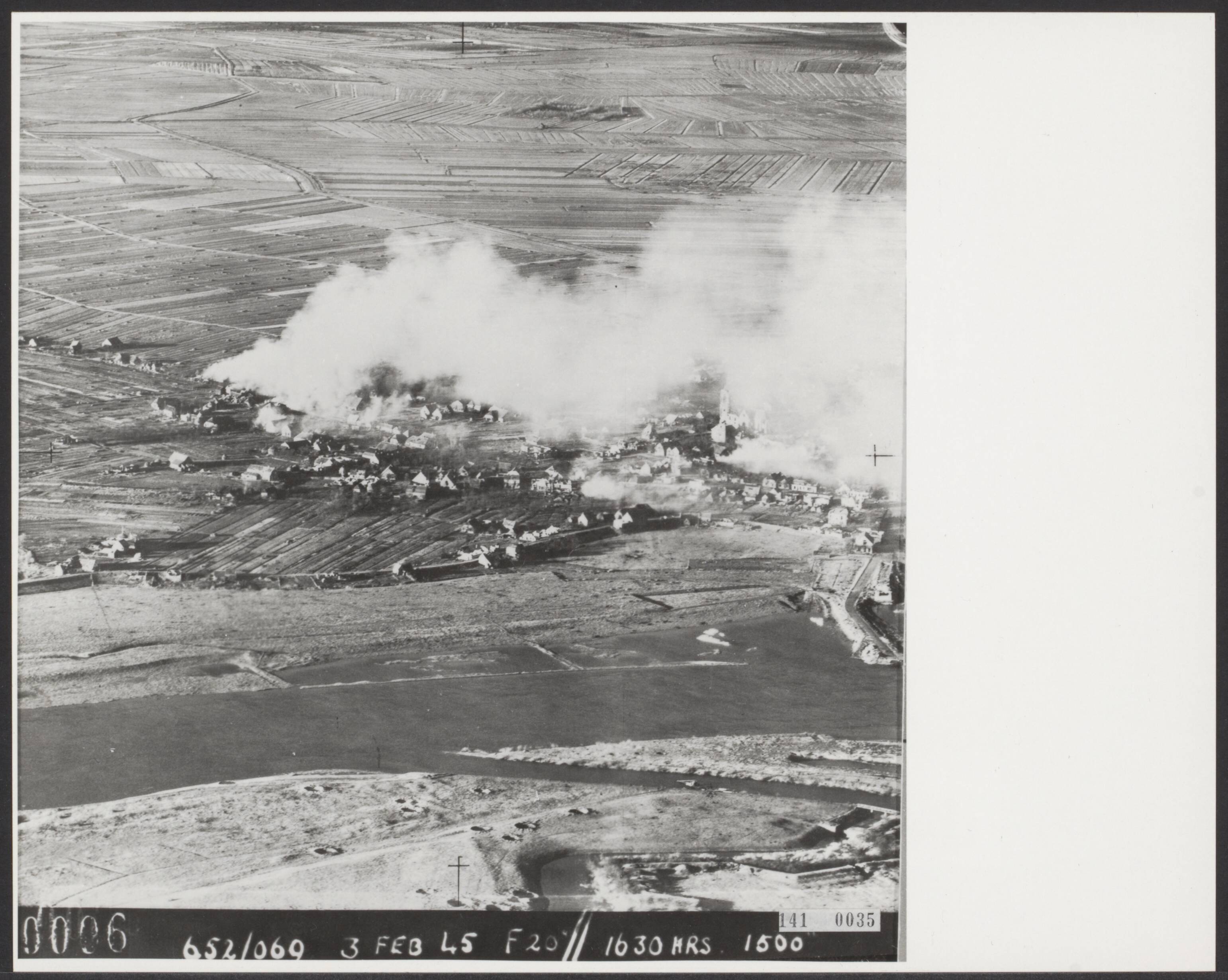 Luchtopname. Beschieting van het dorp Hedel in de Bommelerwaard